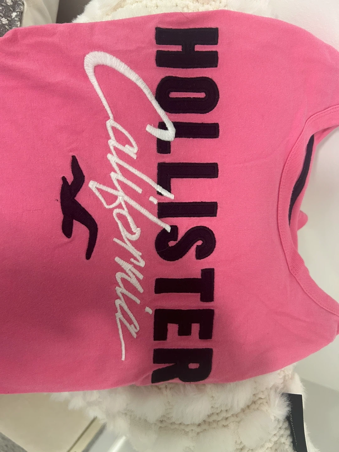 Selling a cute pink Hollister T shirt cotton top! It has the Hollister logo and 'California' written on it. Great for summer! Size medium-large. Fits like a medium. But says a large. Super soft on skin