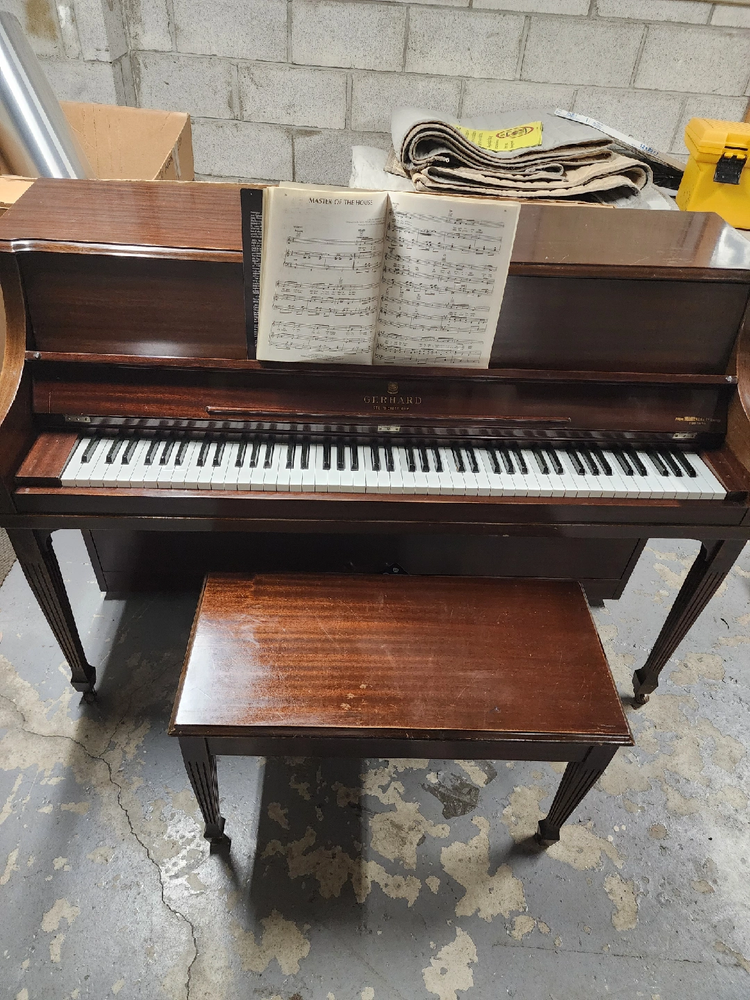 Selling a Gerhard Heintzman piano with a matching bench. It's a beautiful piece of furniture and a great instrument for any musician. It's in good condition and ready for a new home!