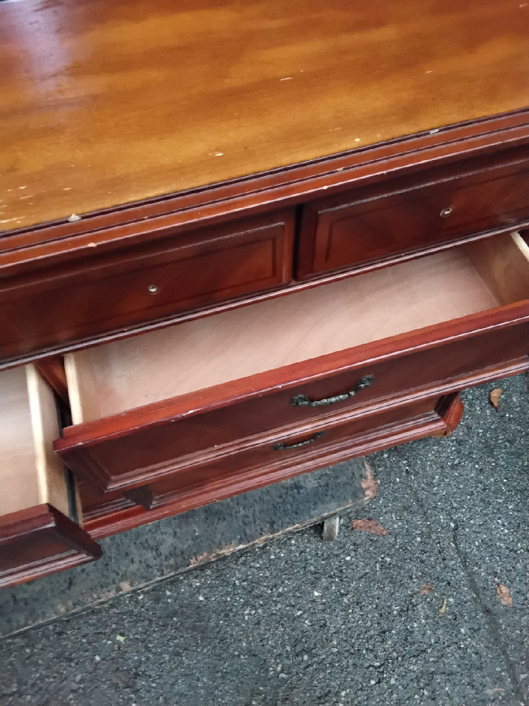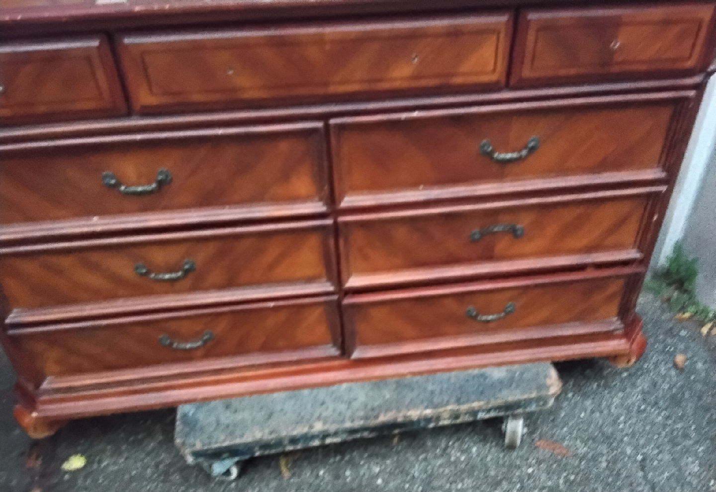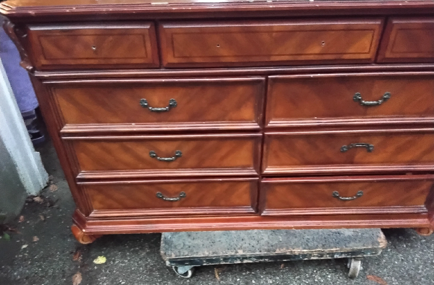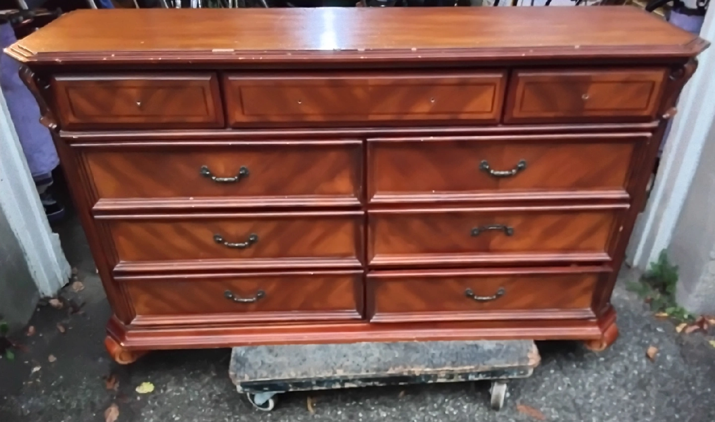 Here's a lovely wood dresser with nine drawers! It only needs the 4 knobs, which is easy to get. I may be able to secure some knobs for this... It's a great piece for adding storage to any bedroom. The dresser has a classic design with a rich wood finish. It's in nice condition and ready to find a new home.