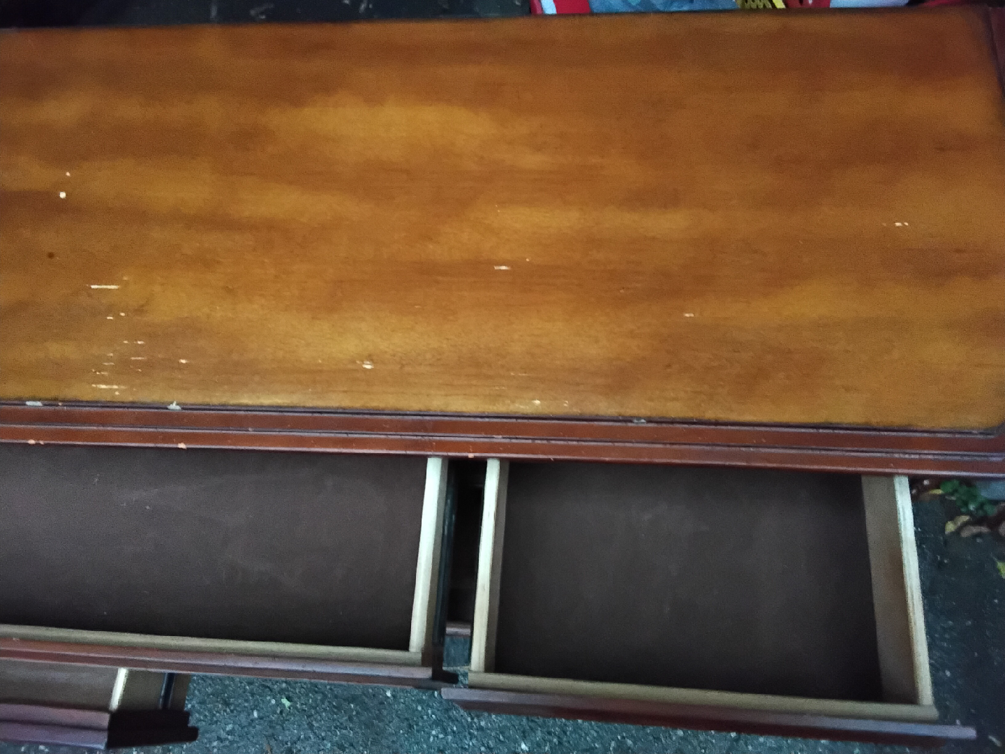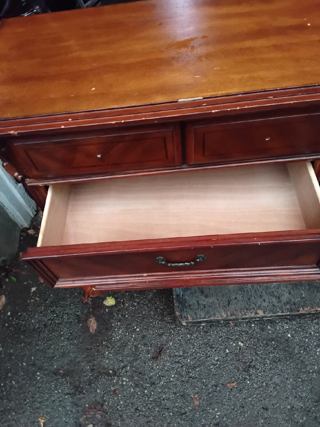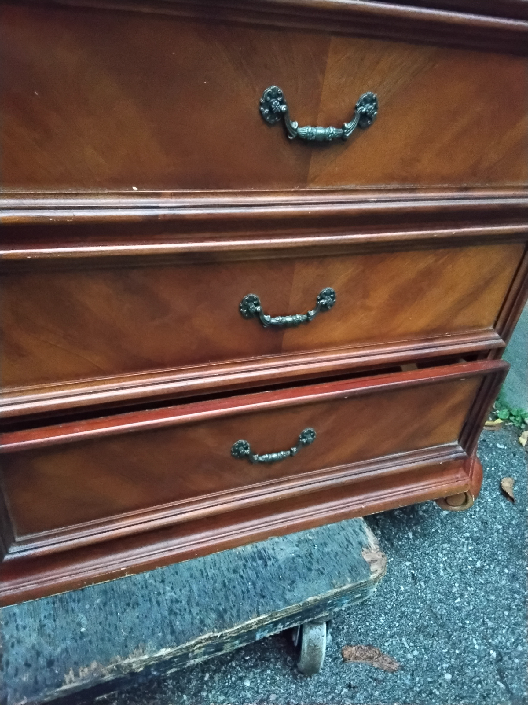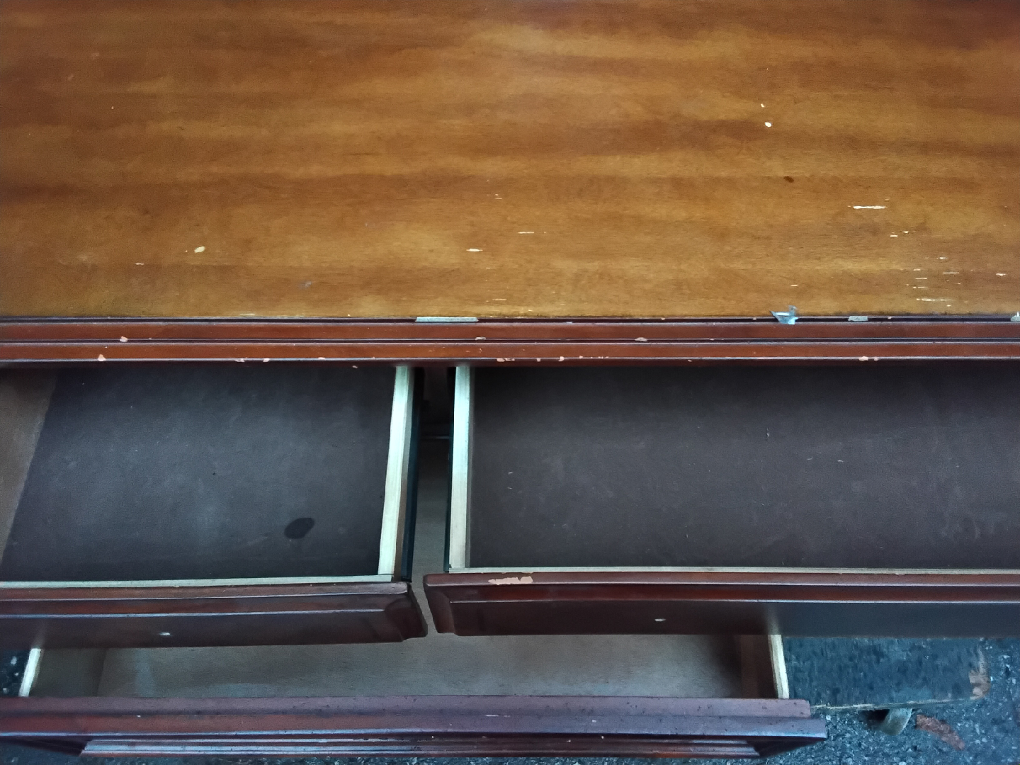 Here's a lovely wood dresser with nine drawers! It only needs the 4 knobs, which is easy to get. I may be able to secure some knobs for this... It's a great piece for adding storage to any bedroom. The dresser has a classic design with a rich wood finish. It's in nice condition and ready to find a new home.