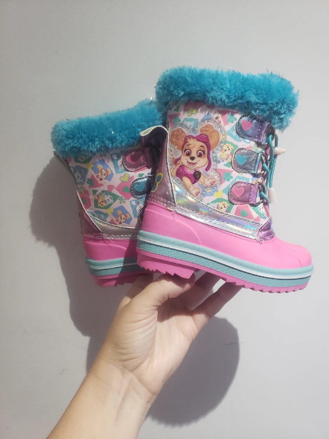 Cute pair of Paw Patrol size 6 winter boots featuring Skye and Everest! They're pink with a fluffy blue trim. Perfect for keeping little feet warm and dry during the winter months! Only worn once (see pic 7 for bottom of shoe)