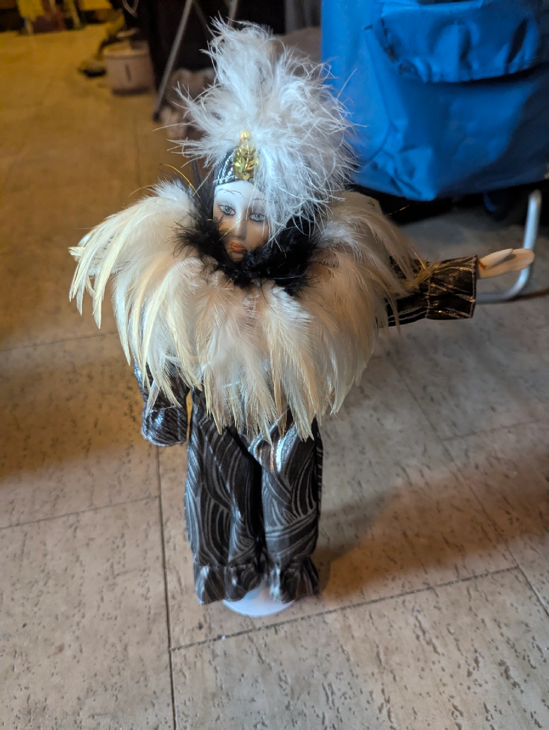 783Selling a porcelain clown doll. It has a white feather collar and a silver and black patterned outfit. It comes with a stand. message with interest and possible offers no holds.