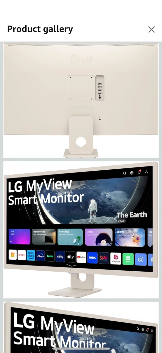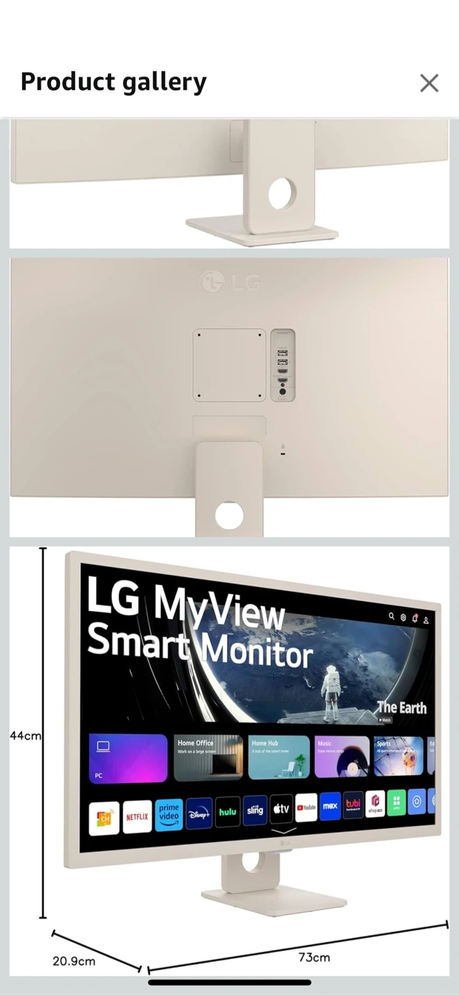 Selling an LG MyView Smart Monitor in white! It's in great shape and ready to go. The monitor measures 44cm in height and 73cm in width, with a depth of 20.9cm. Perfect for your home office or entertainment setup