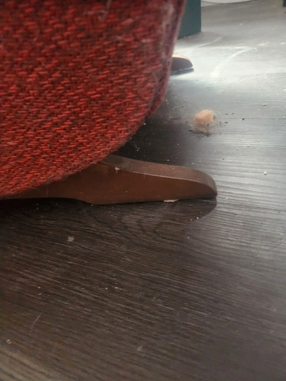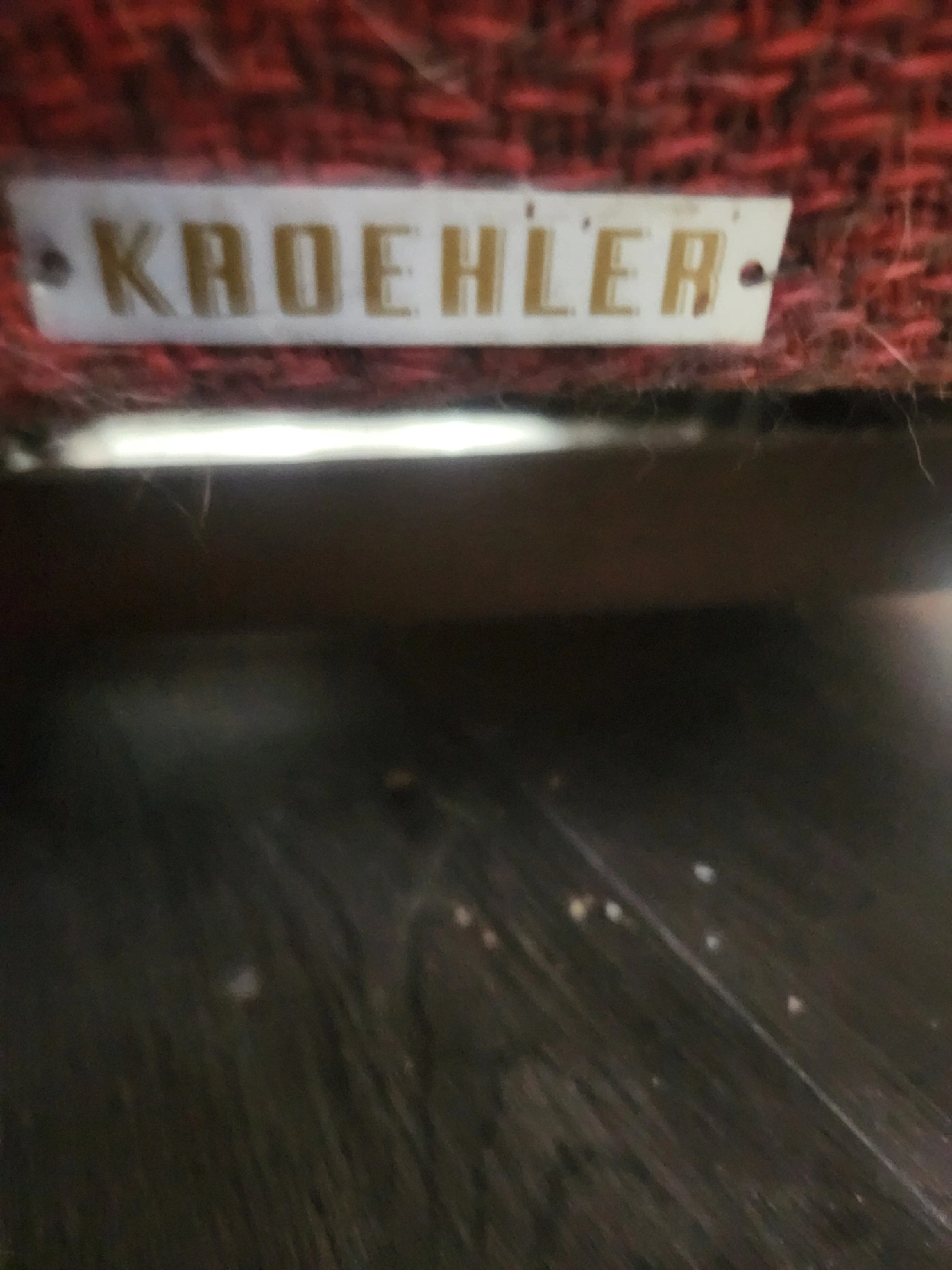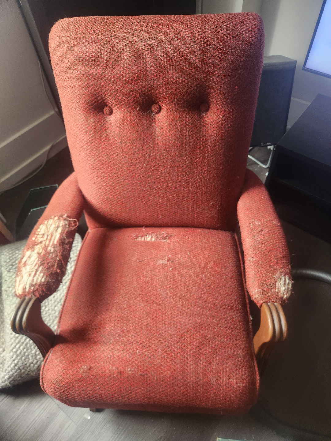 Vintage Kroehler rocking chair, crafted from high-quality materials. It has cat damage, including tears and worn spots on the fabric, but it’s still sturdy and perfect for restoration or use as-is. I’m offering it for free to a good home.