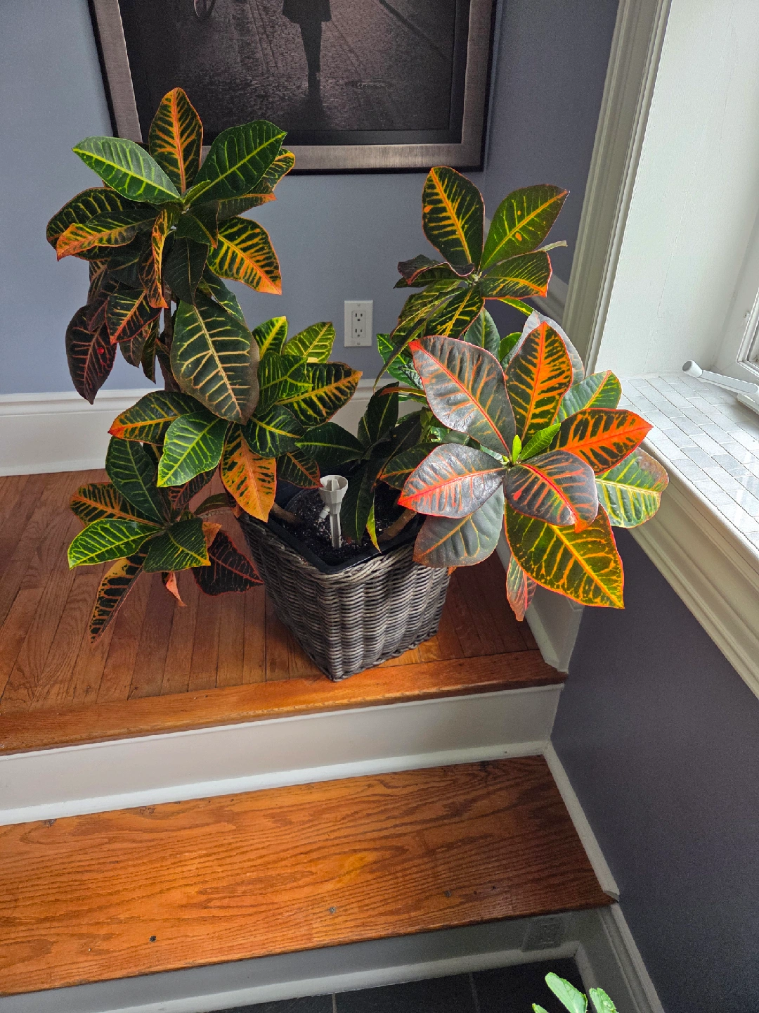 Selling a vibrant Croton plant, potted in a lovely wicker basket. This plant features colourful foliage with a mix of green, yellow, and orange hues, perfect for adding a touch of nature to your home. It's a healthy and well-cared-for plant, ready to brighten up any space!