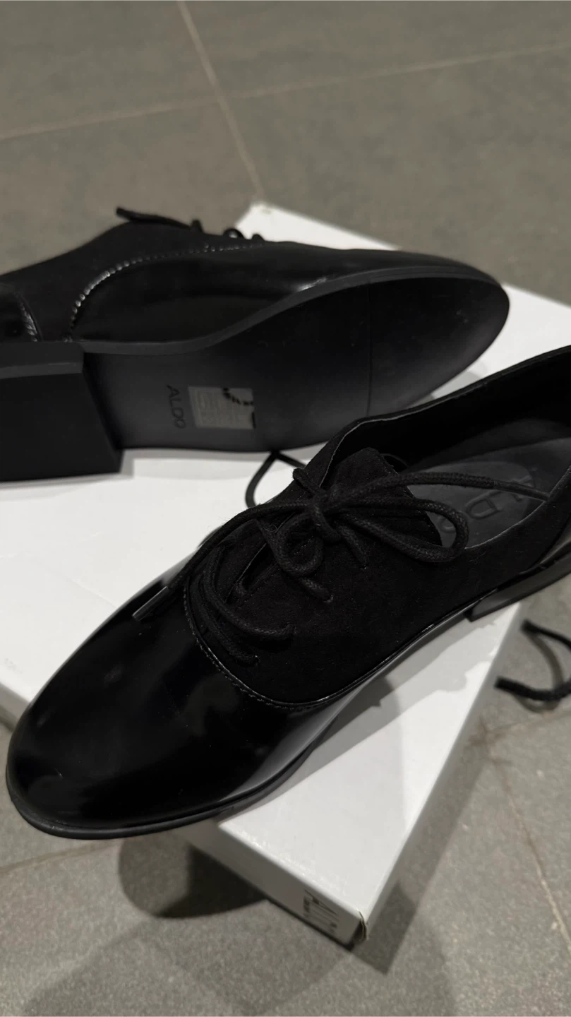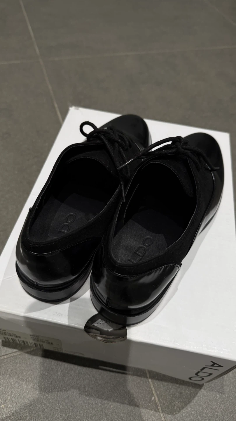 60Selling a pair of ALDO dress shoes in black. Women’s leather and suede shoes with a classic men’s-style design. They are new, never worn and come with the original box!