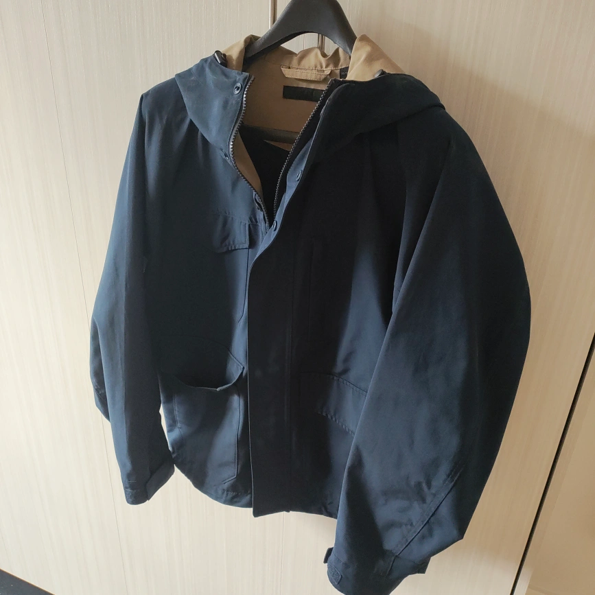 48Here's a navy blue hooded jacket. It's in great condition and ready for a new home! The jacket features a zipper and button closure, along with handy pockets. Perfect for those cooler days!