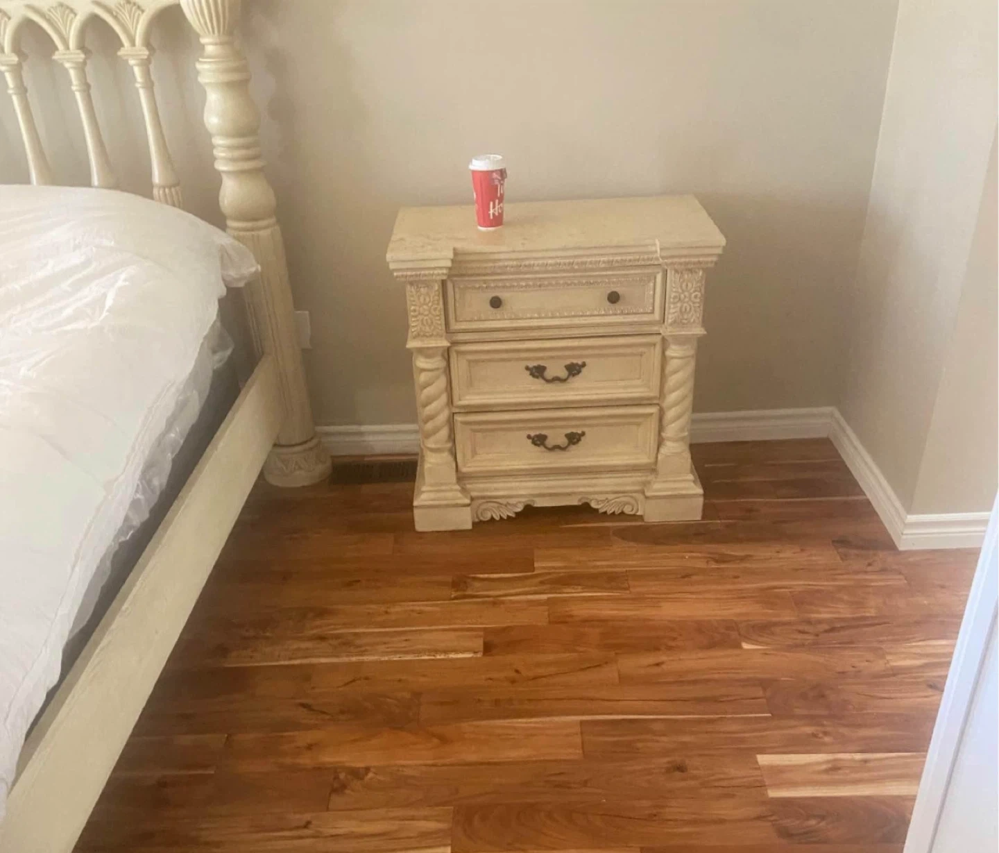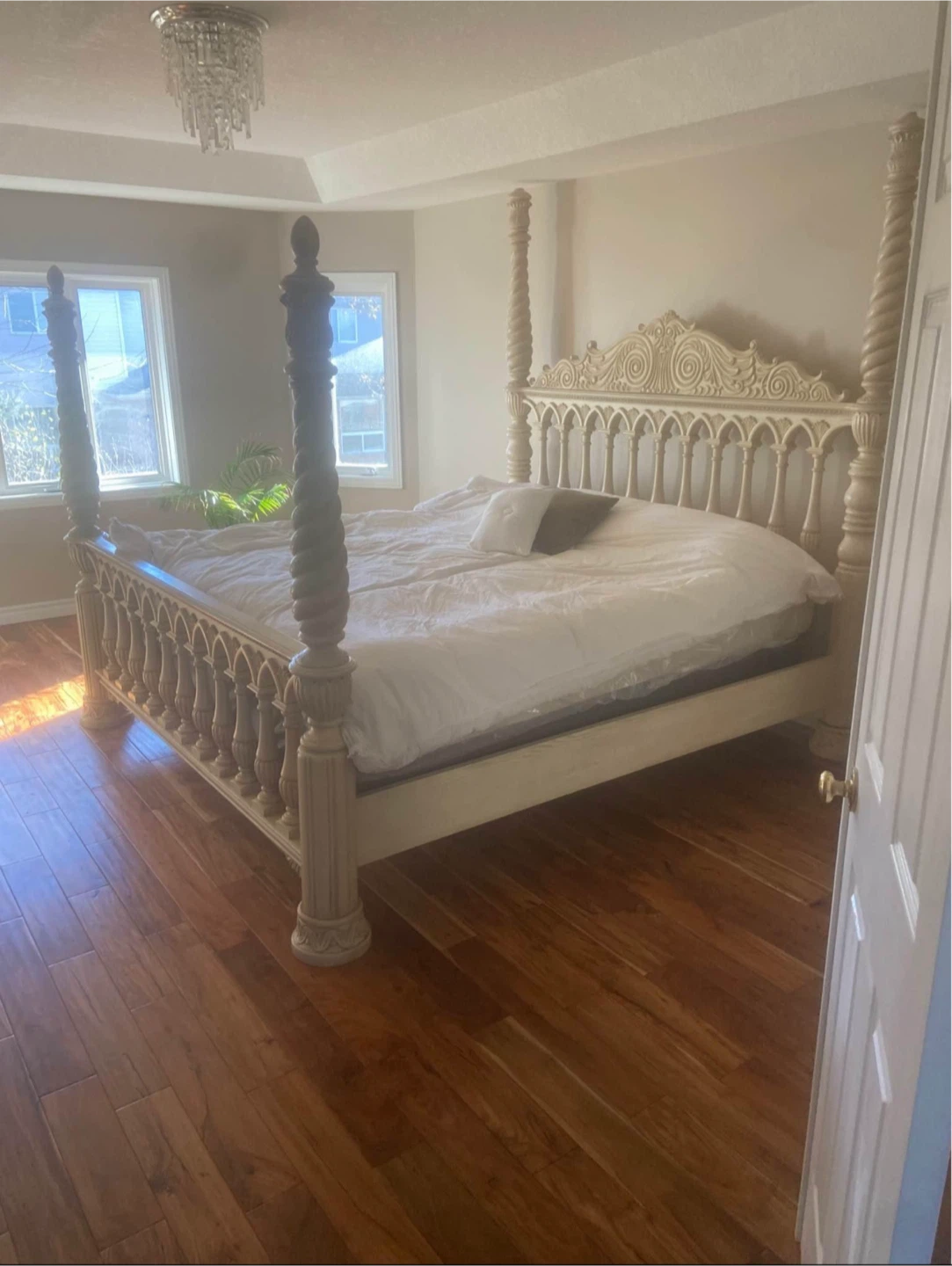 Selling a beautiful antique white bedroom set! It includes a four-poster bed, 2 nightstand, and a large dresser with a mirror. The set features ornate detailing and a classic design, perfect for adding a touch of elegance to your home