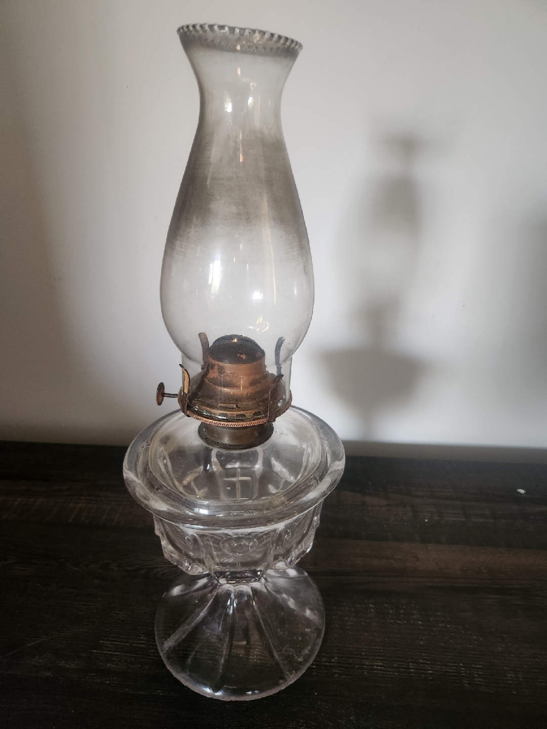Vintage glass oil lamp featuring a clear, intricately designed base and a functional burner, complete with a fresh wick for immediate use (once the wick has soaked in the oil). This elegant piece stands 17" tall and is in good condition with minor wear. Requires oil (not included).