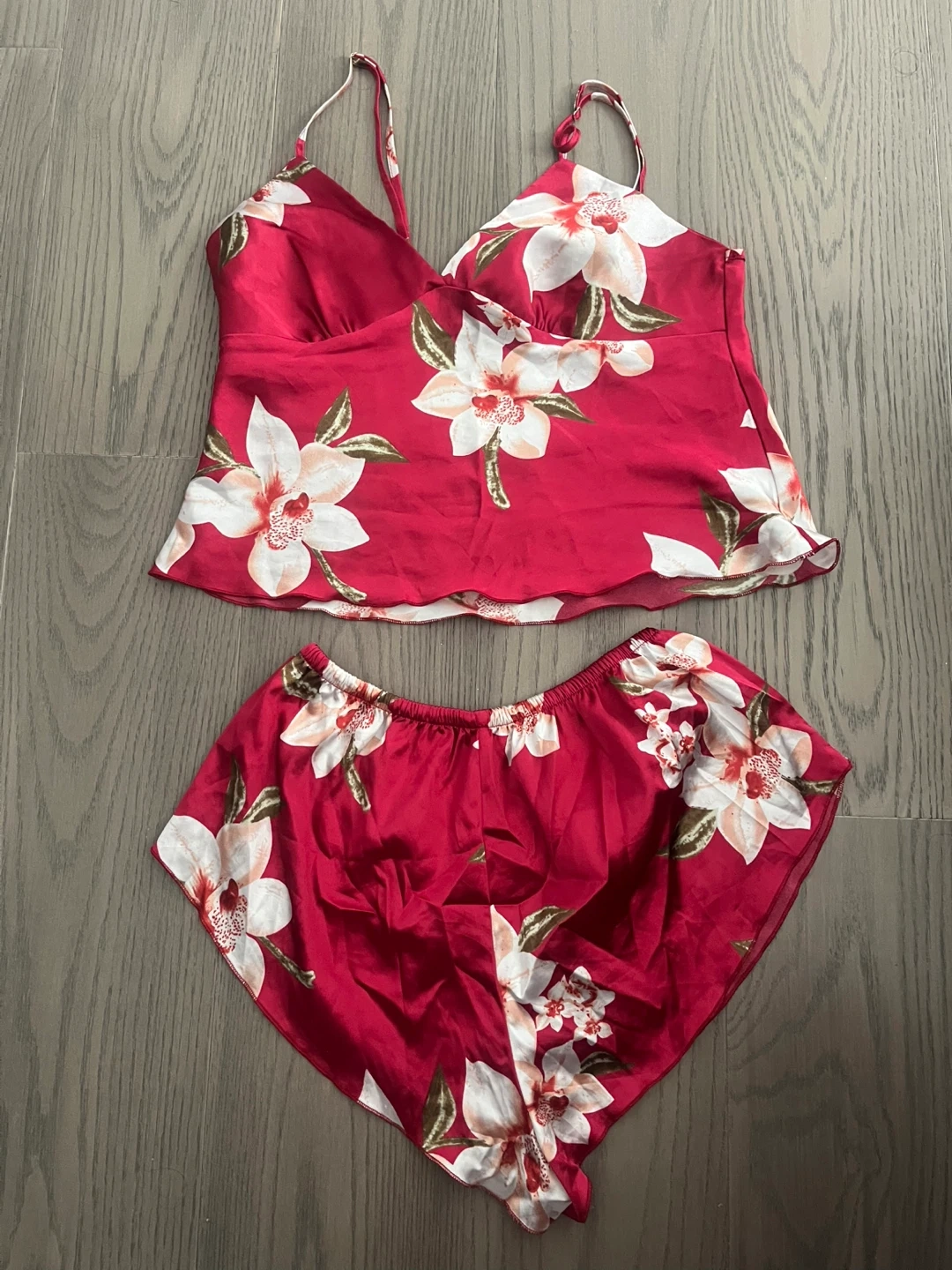This is a cute red pajama set with a floral pattern. It includes a camisole top and shorts. Perfect for a comfy night's sleep!