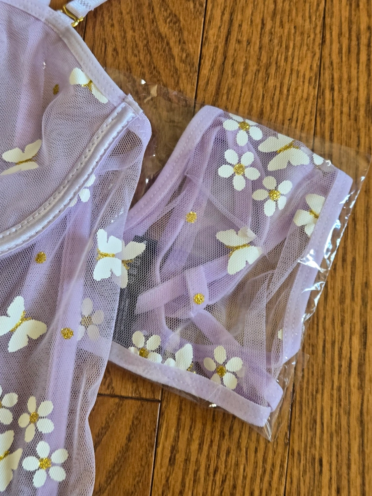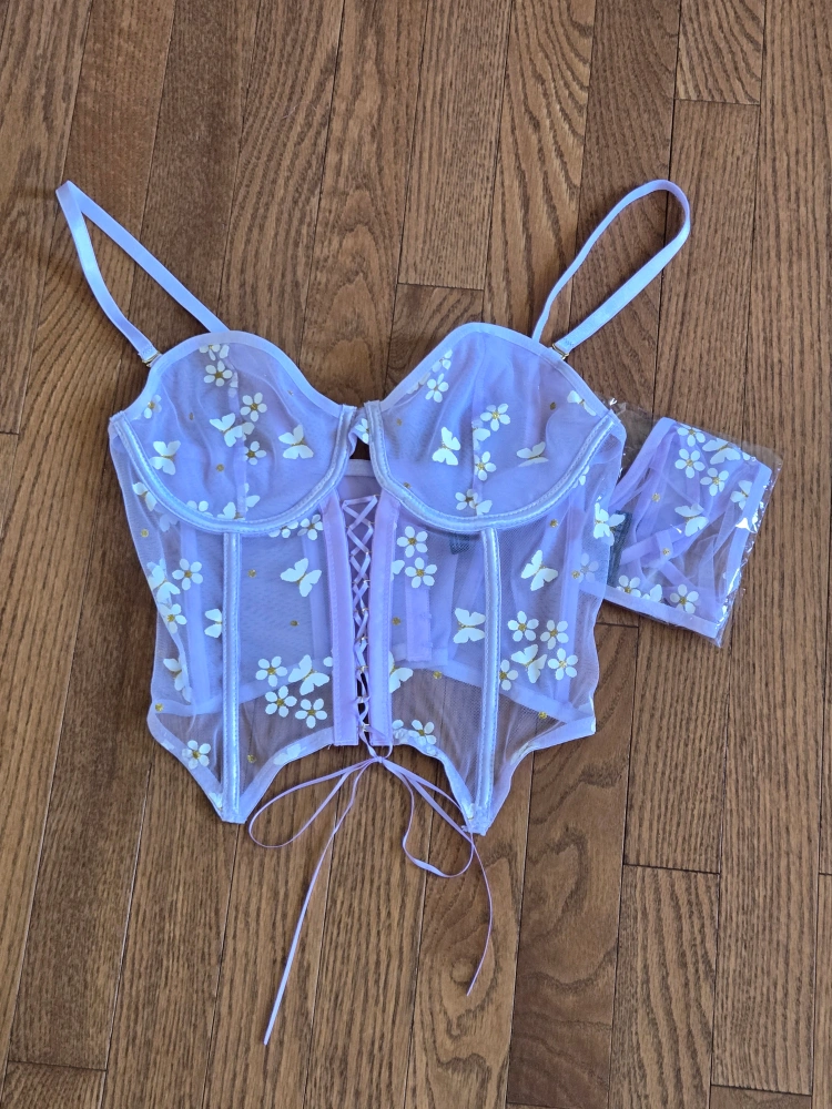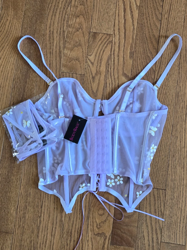 16*brand new never been worn* lavender corset top with a floral and butterfly pattern. Comes with matching panties. Size large. Perfect for Halloween costume or girls night out