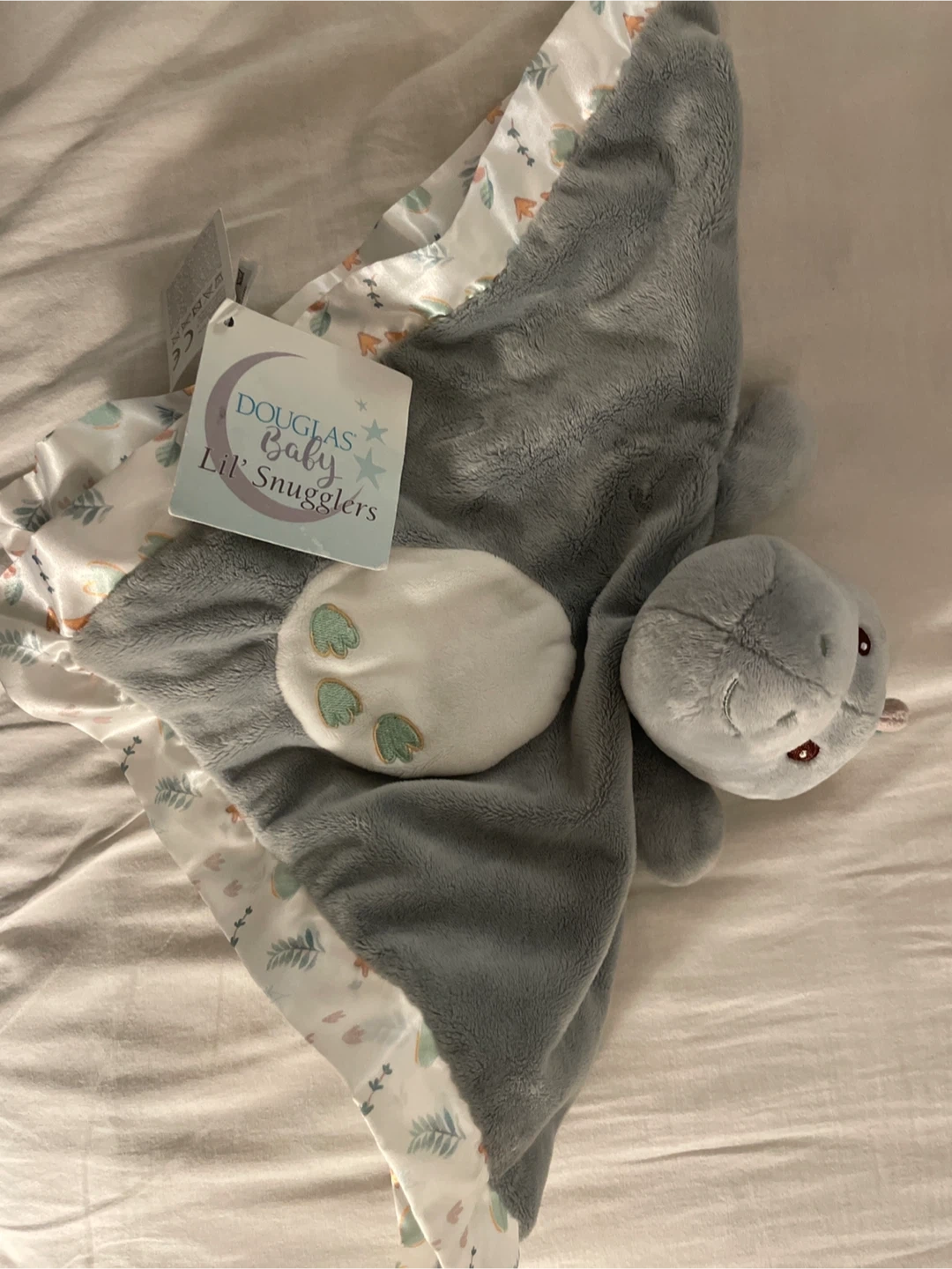 Super cute Douglas Baby Lil' Snugglers hippo plush blanket! The blanket features a soft, plush hippo attached to a silky-edged blanket with a leafy pattern. Perfect for snuggling!