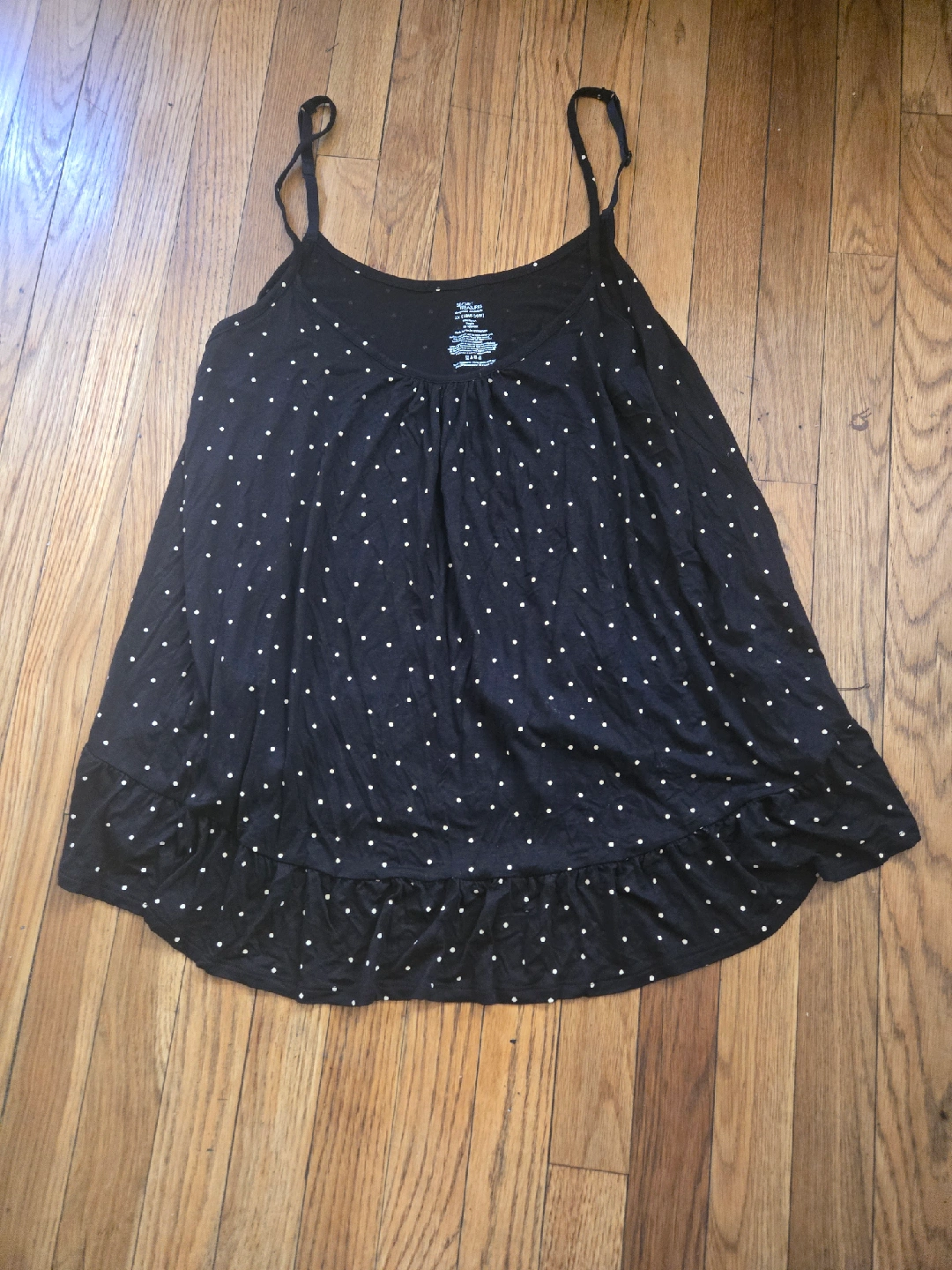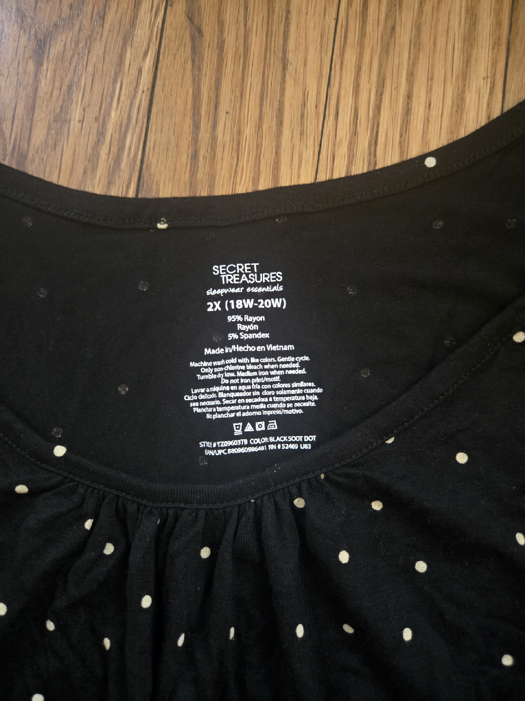 This is a Secret Treasures tank top in size 2X (18W-20W). It's black with a cute polka dot pattern. The material is soft and comfy, made of 95% rayon and 5% spandex