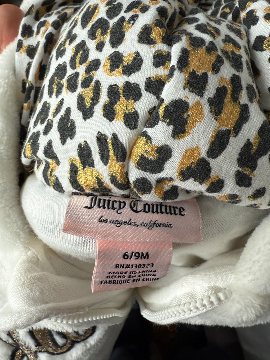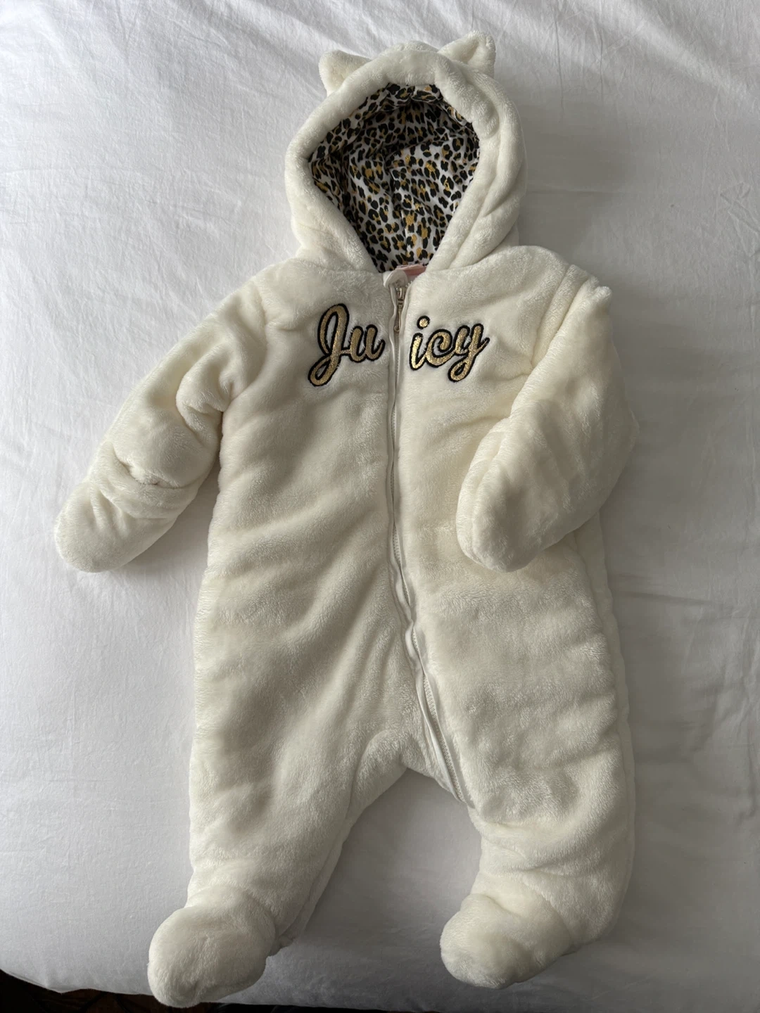 Super cute Juicy Couture baby snowsuit, size 6/9 months! It's white with a fun leopard print lining in the hood and the classic Juicy logo on the front. Wore a few times For Pick up Cash/e-transfer