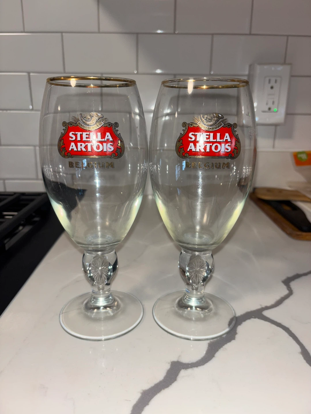 Here's a set of two Stella Artois beer glasses! They feature the classic Stella Artois logo and a gold rim. Perfect for enjoying your favorite brew at home.