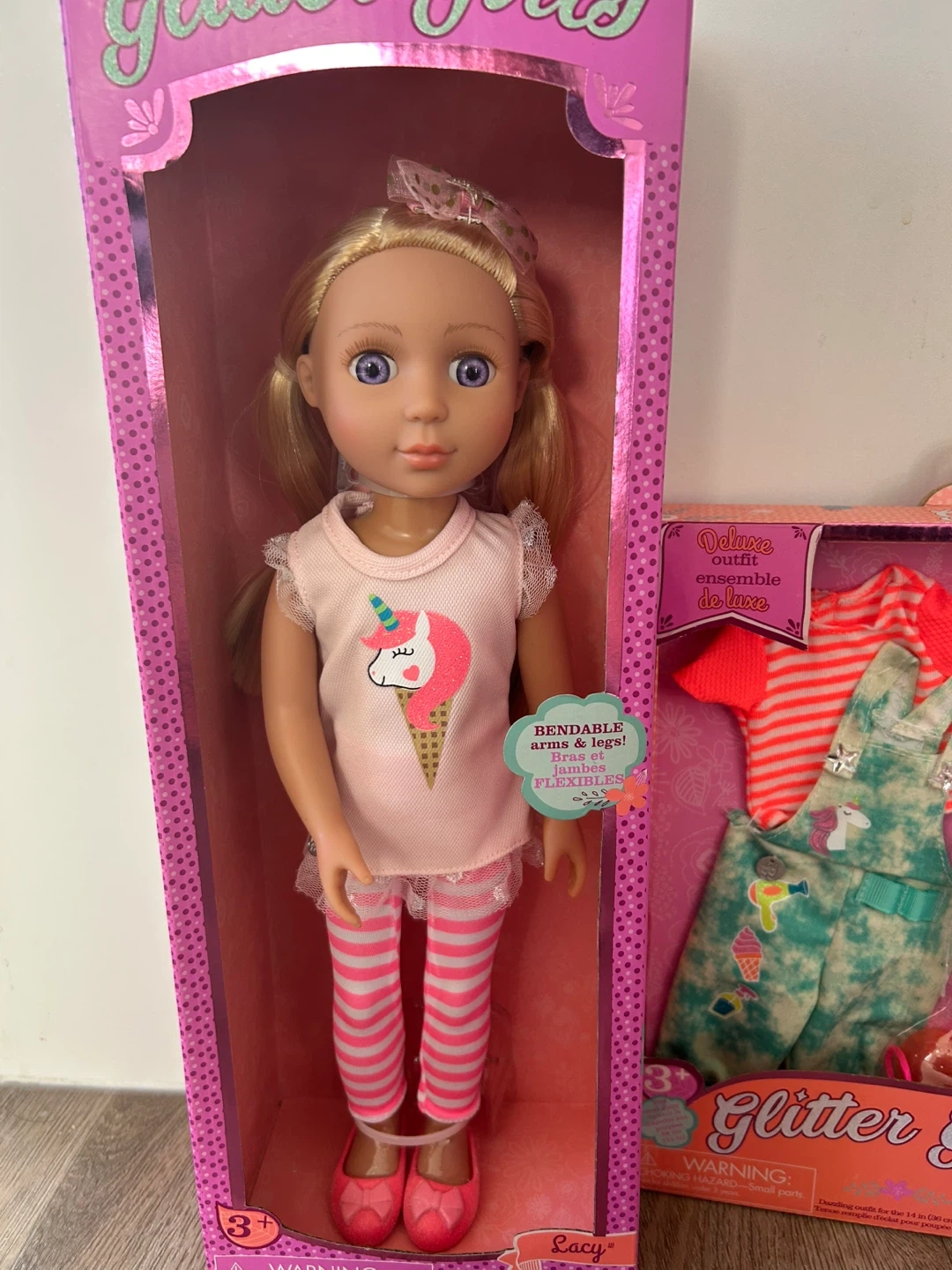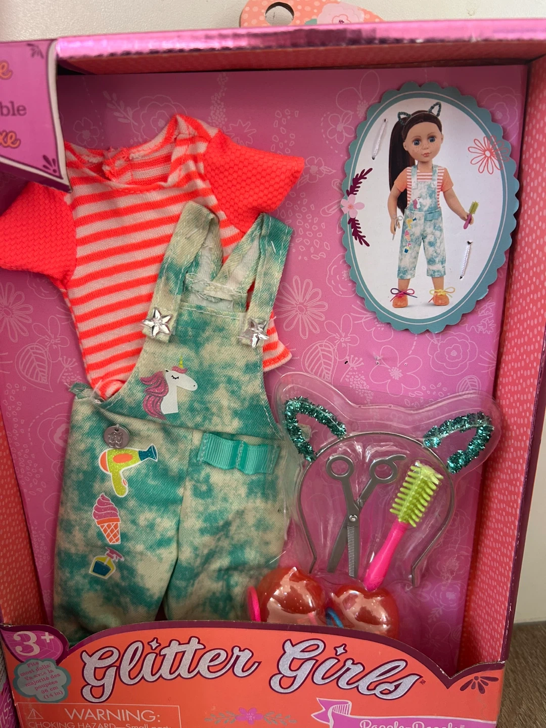 -Glitter Girls Lacy doll and a Razzle-Dazzle deluxe outfit set! The doll has bendable arms and legs for lots of fun poses. The outfit set includes a headband, top, overalls, and accessories like a pair of scissors and a brush. -Recommended for ages 3+