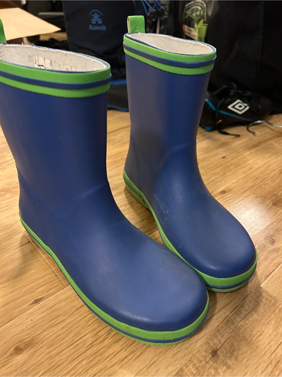 These George brand rain boots are perfect for puddle jumping! They're a size 3 and feature a fun blue colour with green trim. Great for keeping little feet dry on rainy days!