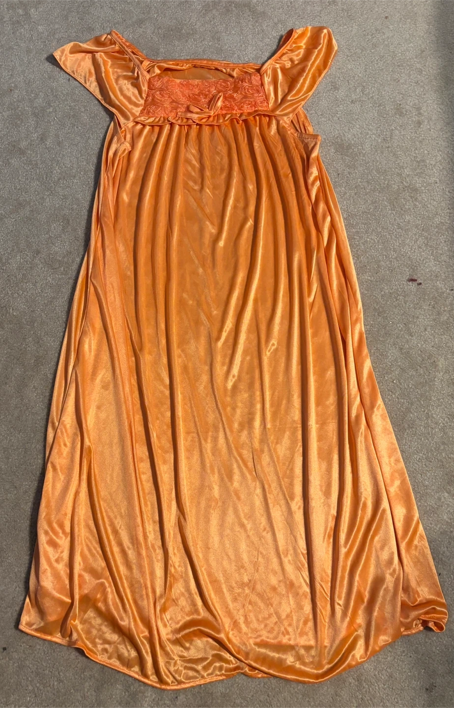 97Here's a beautiful orange satin nightgown with lace top! Length 40 inches. It's in great condition and features delicate rose detailing on the bodice. Perfect for a cozy night in!