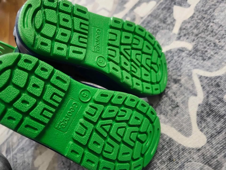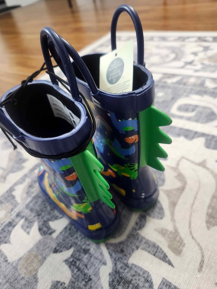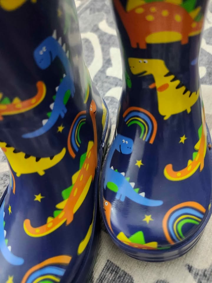 Keep your little oneβs feet dry in style! These George brand rain boots feature a fun dinosaur and rainbow pattern on a navy blue background, plus adorable green dinosaur tails at the back for extra cuteness. π¦π