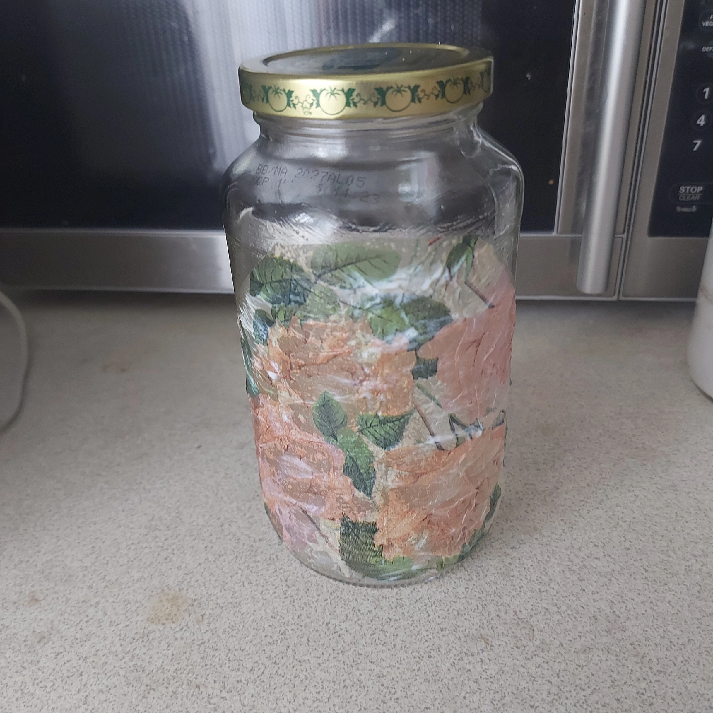 75Check out this charming handcrafted jar! It features a lovely floral design, perfect for adding a touch of spring to your home decor. The jar is in great condition and ready to brighten up any space. Rinse inside, pat dry with paper towel.