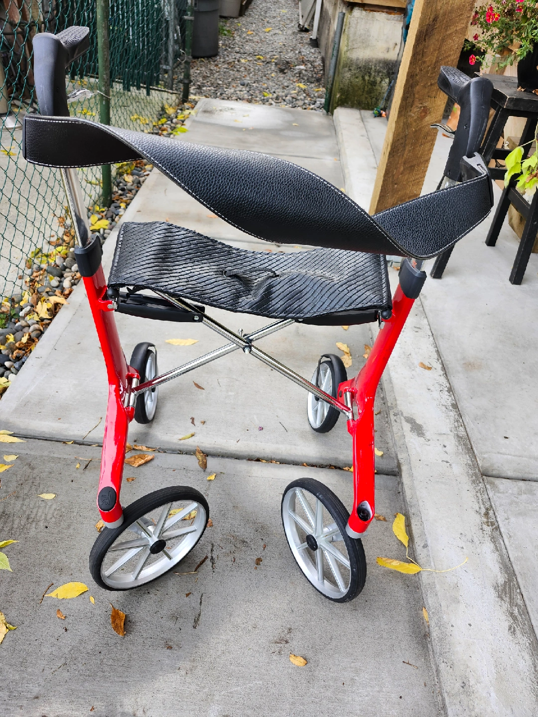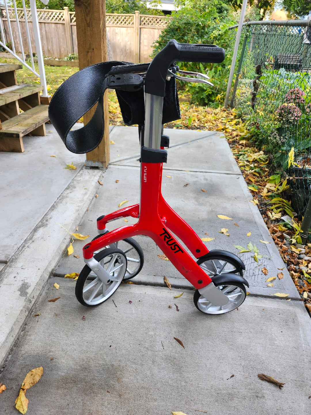Selling a Trust Let's Fly rollator in red. This lightweight and portable rollator is in great condition and ready to assist you with mobility. It's a stylish and practical mobility aid!