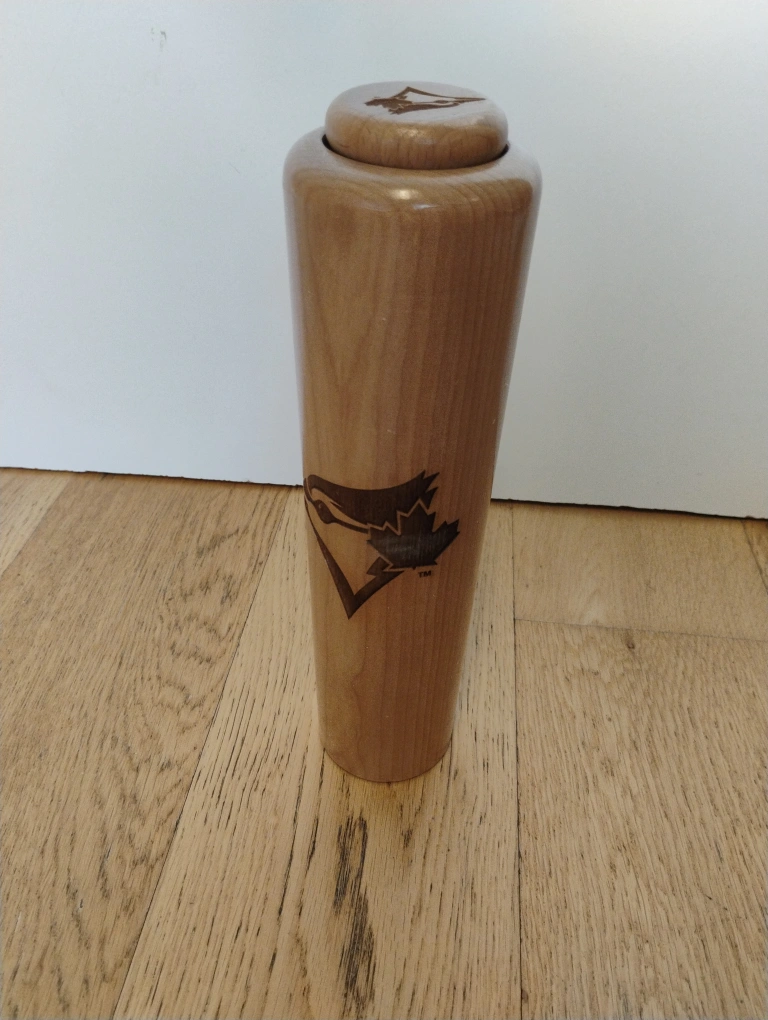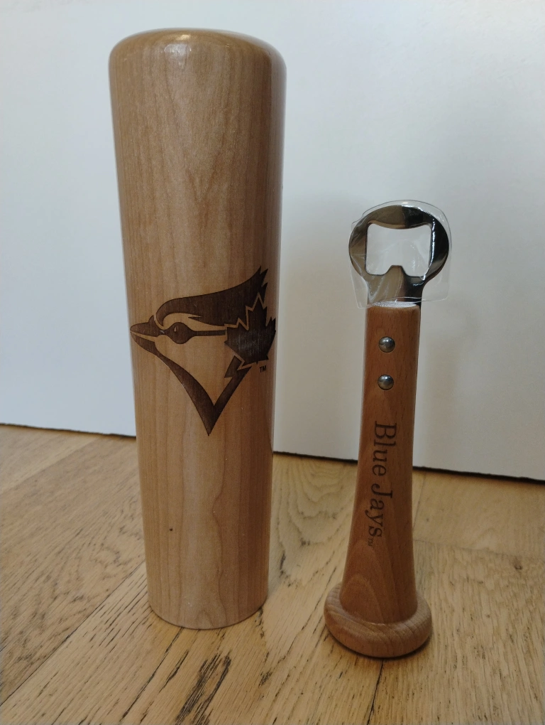 53Toronto Blue Jays wooden baseball bat bottle opener and drinking cup. It's in great condition and would be perfect for any Blue Jays fan!