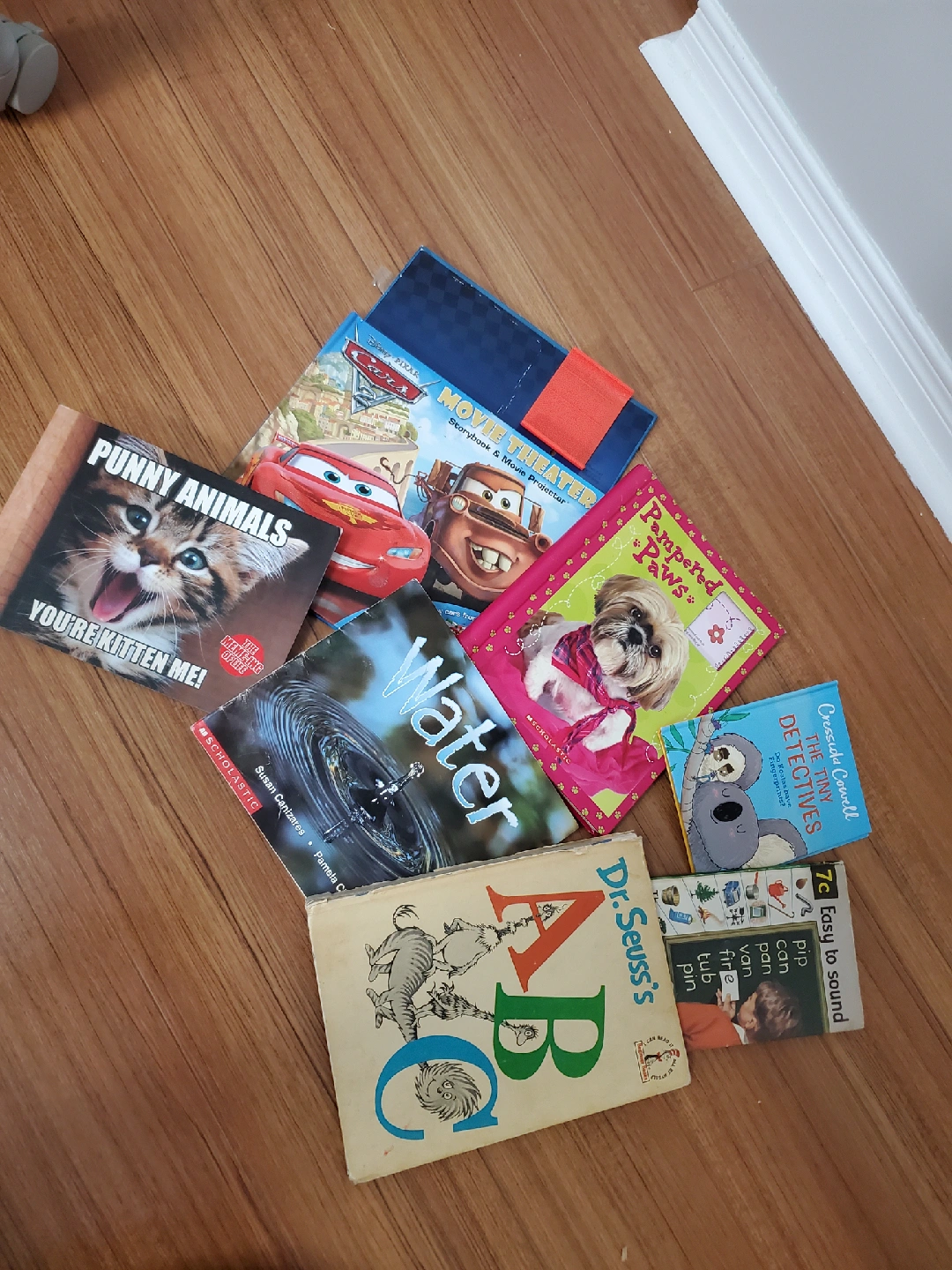 429offeeing fir free a collection of children's books! Includes titles like: - Disney Pixar Cars Movie Theater Storybook & Movie Projector - Punny Animals: You're Kitten Me! - Water by Susan Canizares & Pamela C. - Pampered Paws - Dr. Seuss's ABC - Cressida Cowell The Tiny Detectives - 7c Easy to Sound
