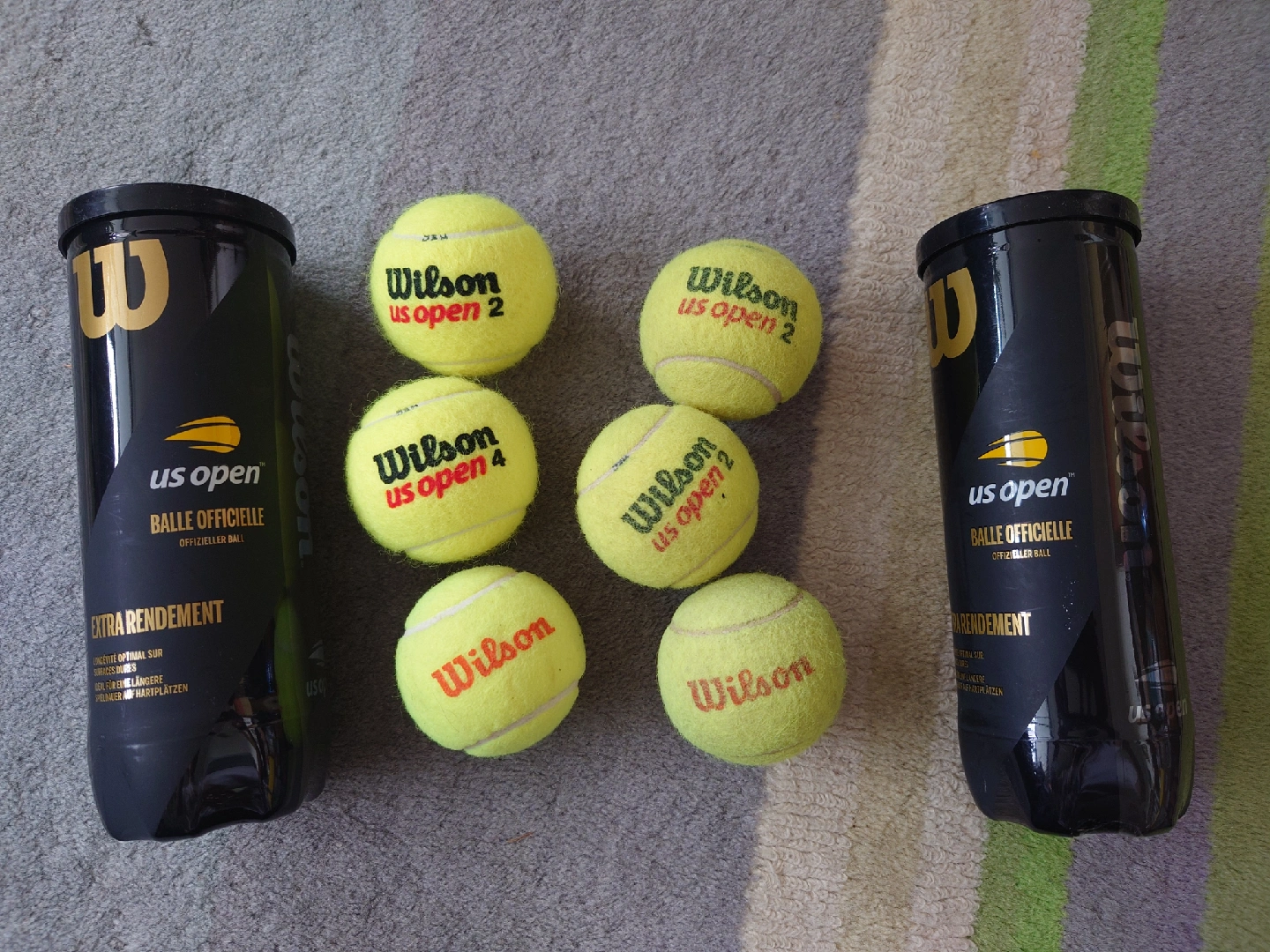Selling a set of Wilson US Open tennis balls. They are in good condition and ready for your next match! Includes two cans and six tennis balls