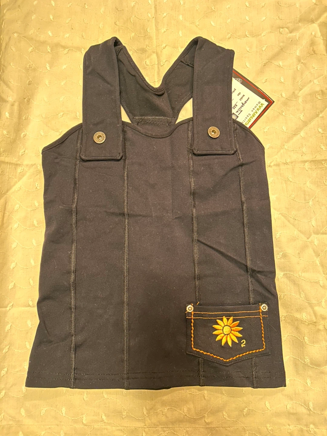 The top is a size 1 (size small) and has a unique gold embroidered margarita flower design with a small pocket detail on the front. Perfect for workouts, yoga or casual wear.