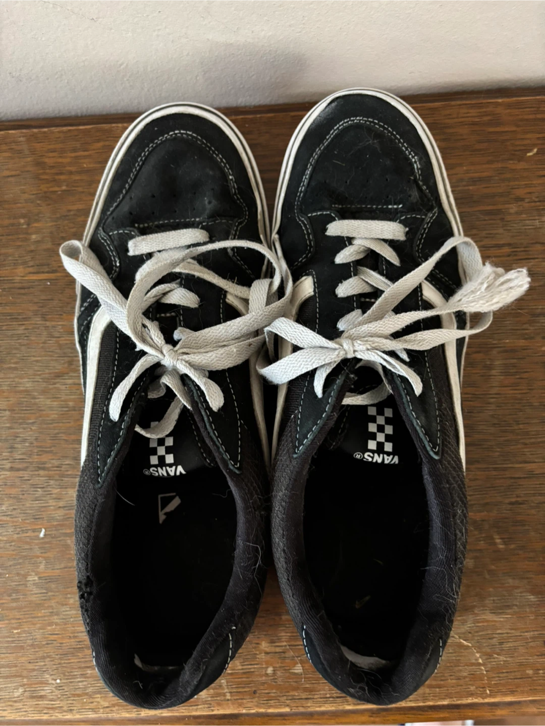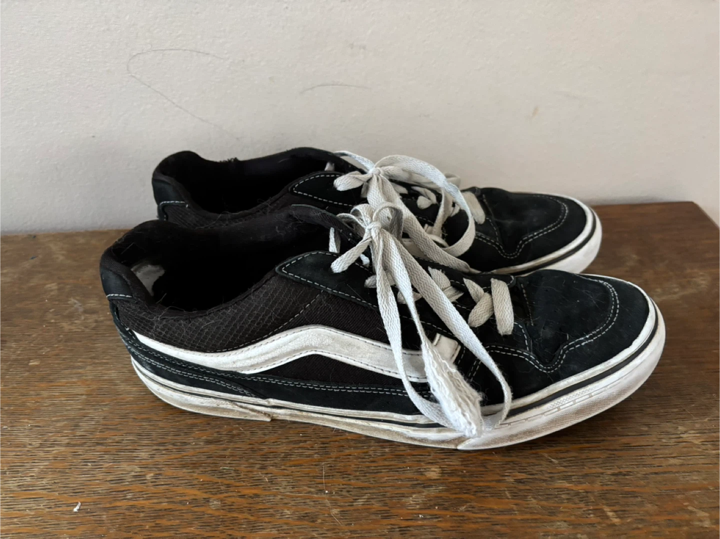 Selling a pair of Vans sneakers in black and white. They're in used condition, as you can see from the photos. Size is US 10.5 Men’s