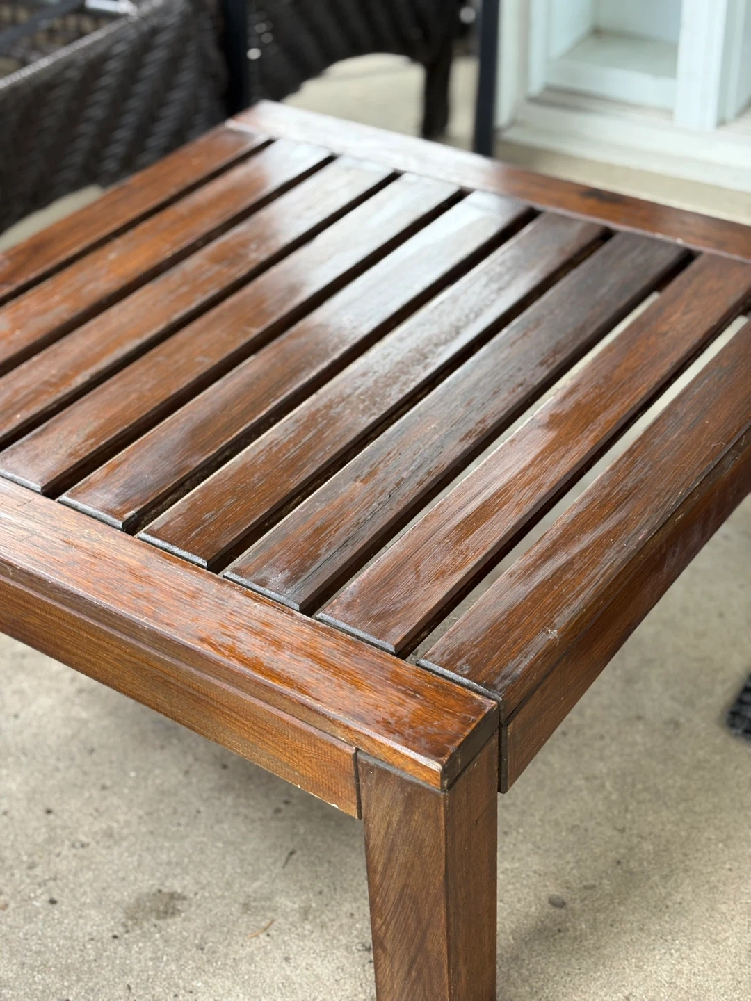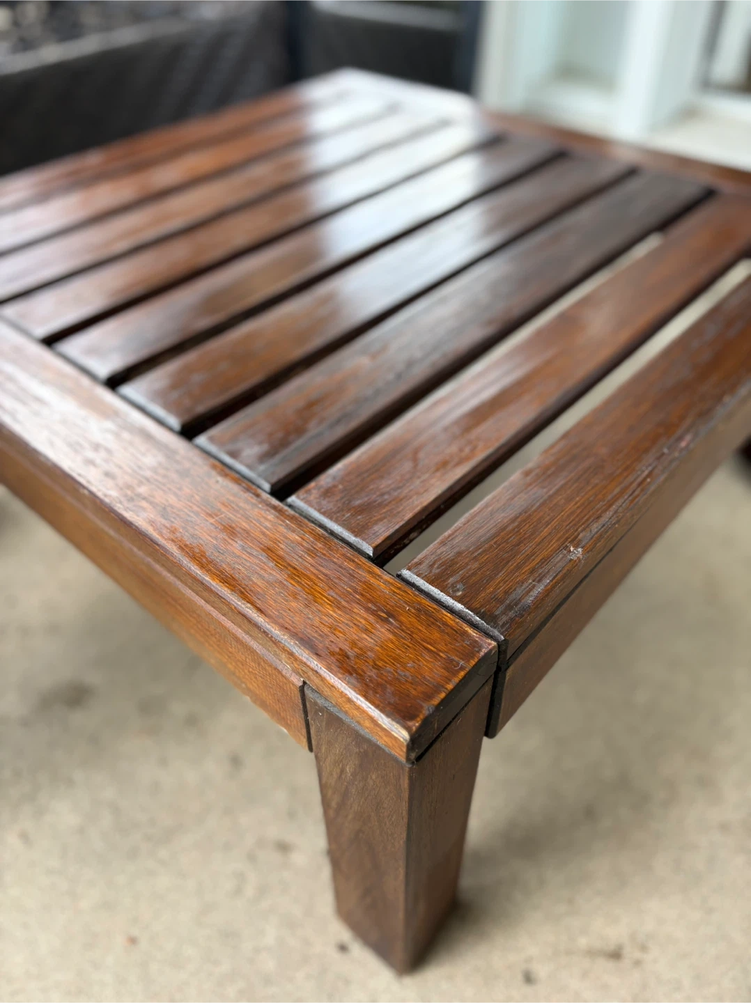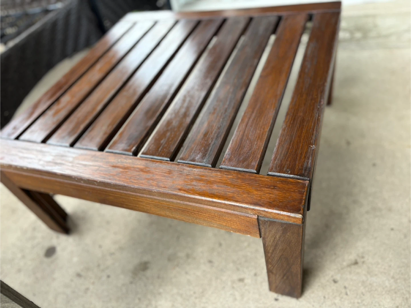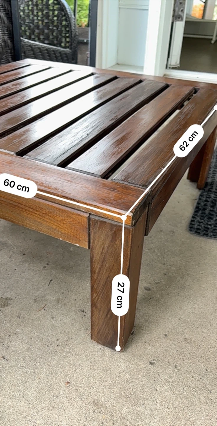 Selling a lovely wooden side table. It's in great condition and perfect for adding a touch of warmth to your living space or patio. The dimensions are 60cm x 62cm, and it stands 27cm tall
