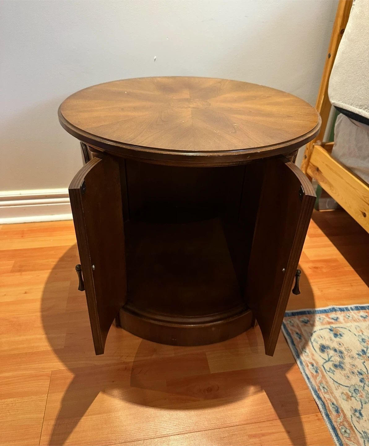 Selling a lovely round wooden side table. It has a beautiful wood grain design on the top and features a storage compartment with doors. A great addition to any living room or bedroom!