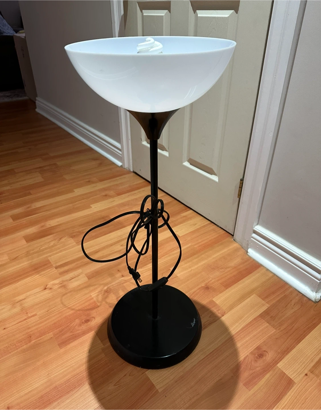 Selling a modern floor lamp with a black base and white shade. It's in great condition and would look great in any room! The lamp provides a nice, ambient light and is perfect for reading or relaxing