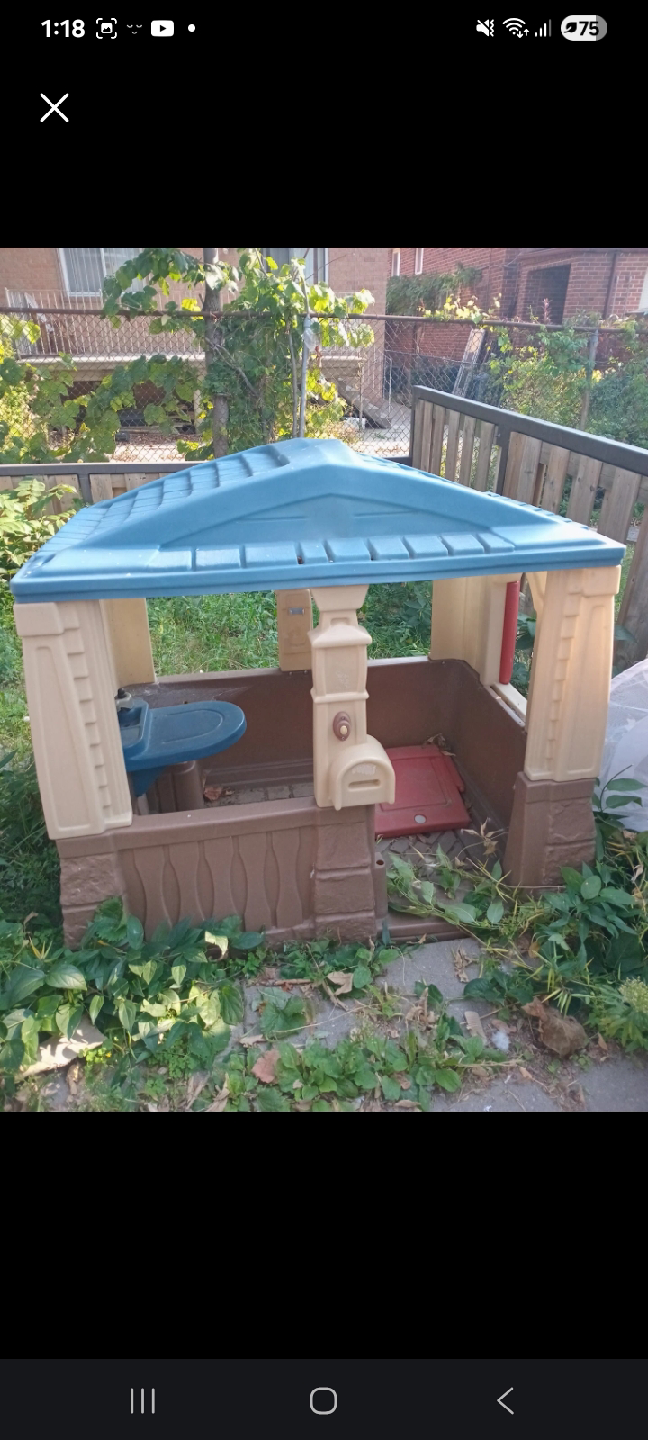 Kids playhouse, perfect for outdoor fun and imaginative play! It has a blue roof and a little door. There is some wear and tear from being outside, but it's still lots of fun for the kids. Message if interested. Pick up only. Jane and Finch.