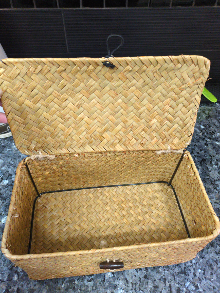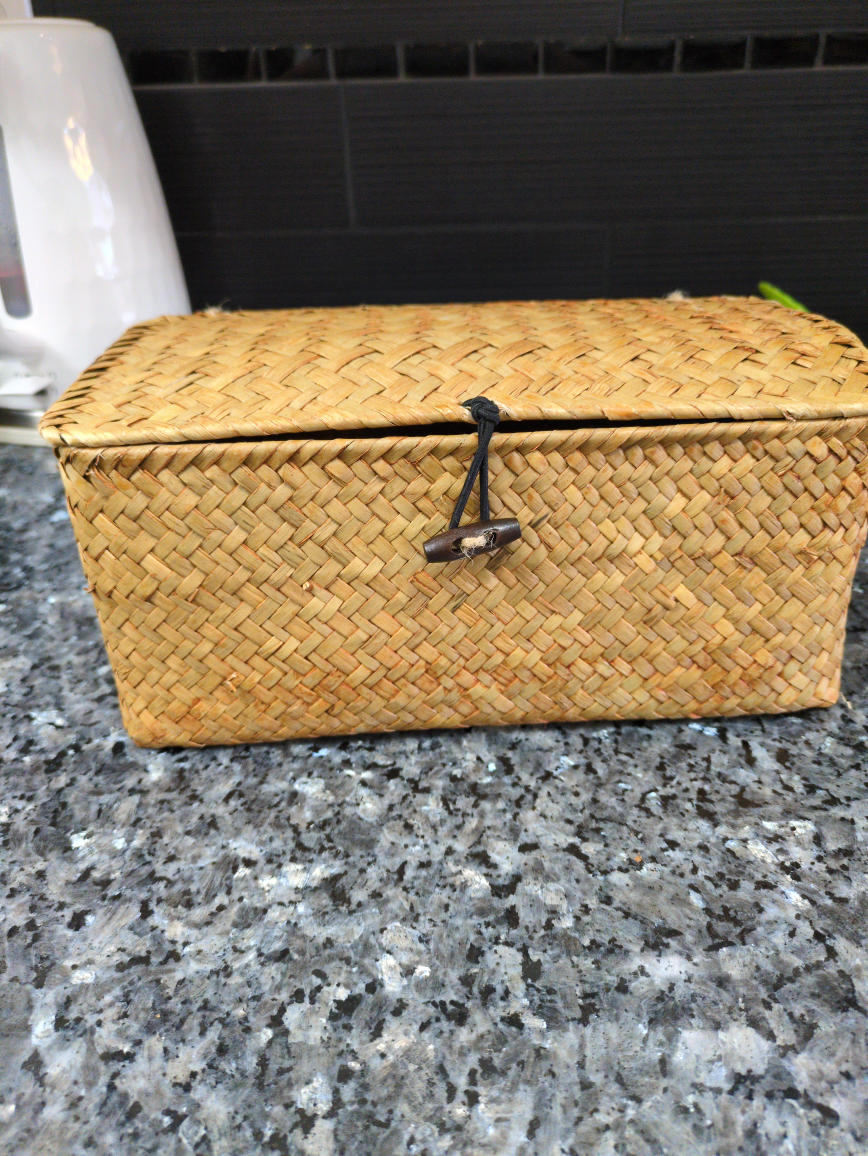 Here's a cute woven straw storage box with a lid! It's perfect for storing all sorts of things around the house. The box is a little larger than a standard box of facial tissues (see last photo).