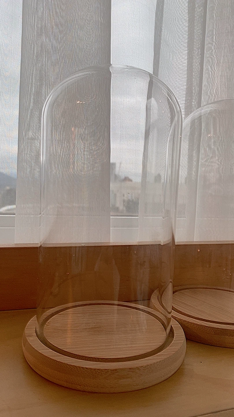 258Selling a glass cloche dome with a wooden base. It's in great condition and perfect for displaying small items or creating a decorative centerpiece. The base measures approximately 13 cm in diameter and the dome is around 26 cm tall