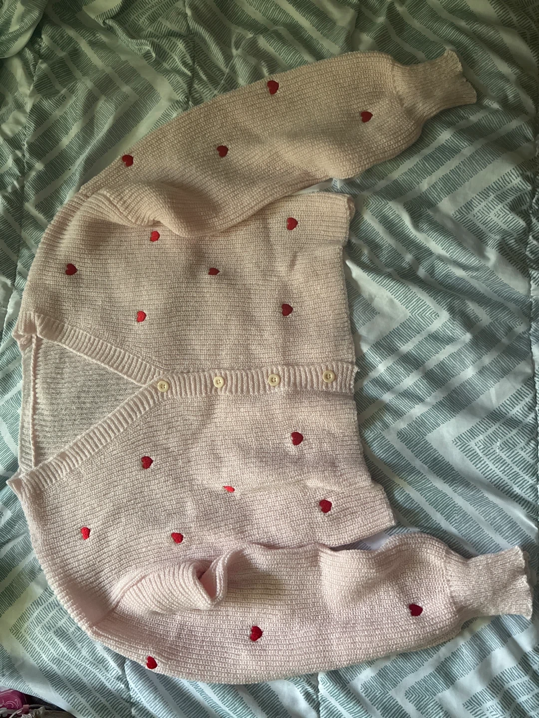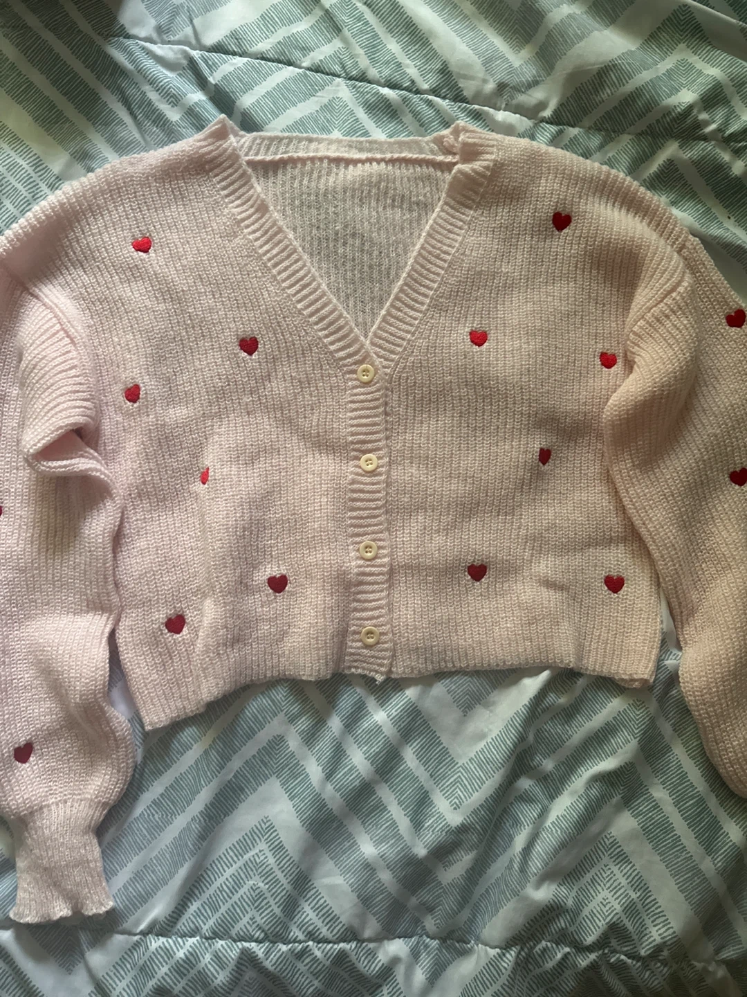 Selling a cute pink cardigan with a heart pattern. It's in great condition and perfect for layering! The material is soft and cozy, ideal for chilly days.