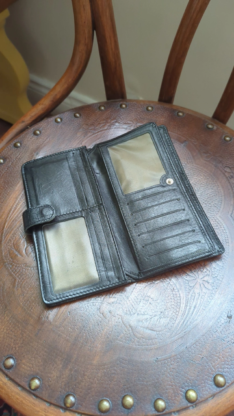 Selling a black leather wallet. It has a crocodile skin pattern on the outside and plenty of slots for cards and cash inside. It's in good condition.