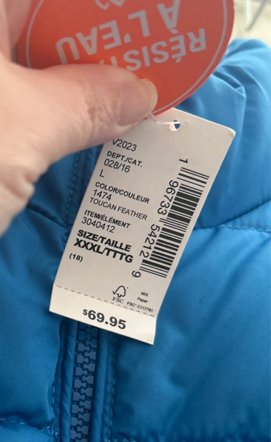Here's a bright blue puffer jacket that's water resistant! It's lightweight and perfect for layering on those chilly Canadian days.