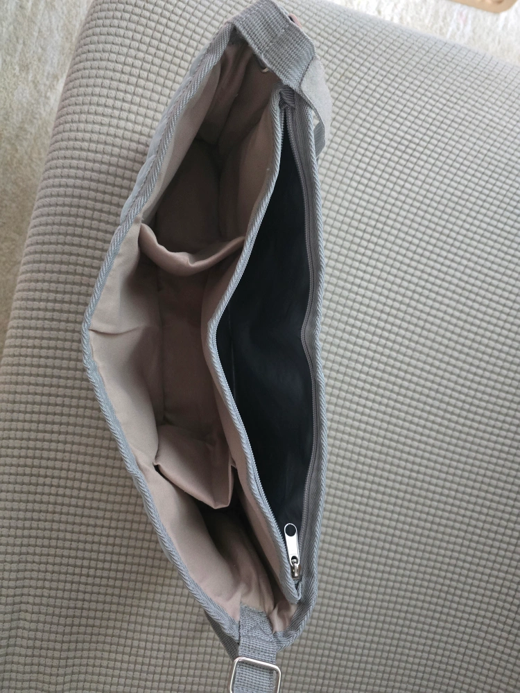 118Large light blue stroller caddy/organizer. It has two bottle holder pockets, one insulated pocket with zipper and open center space for all the necessities. Straps with strong velcro. Holds really well. Used it with UppaBaby Cruz V2. Dimensions are: H 7" x W 15" x D 4".