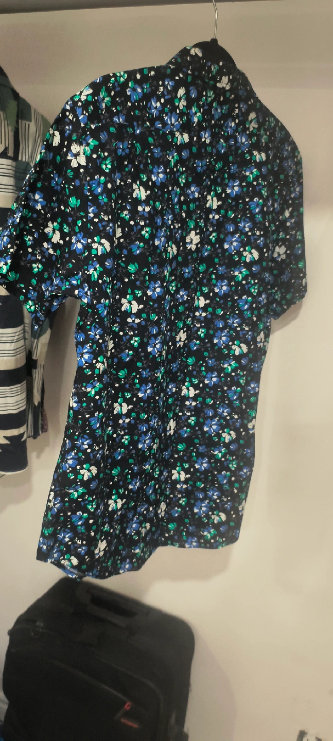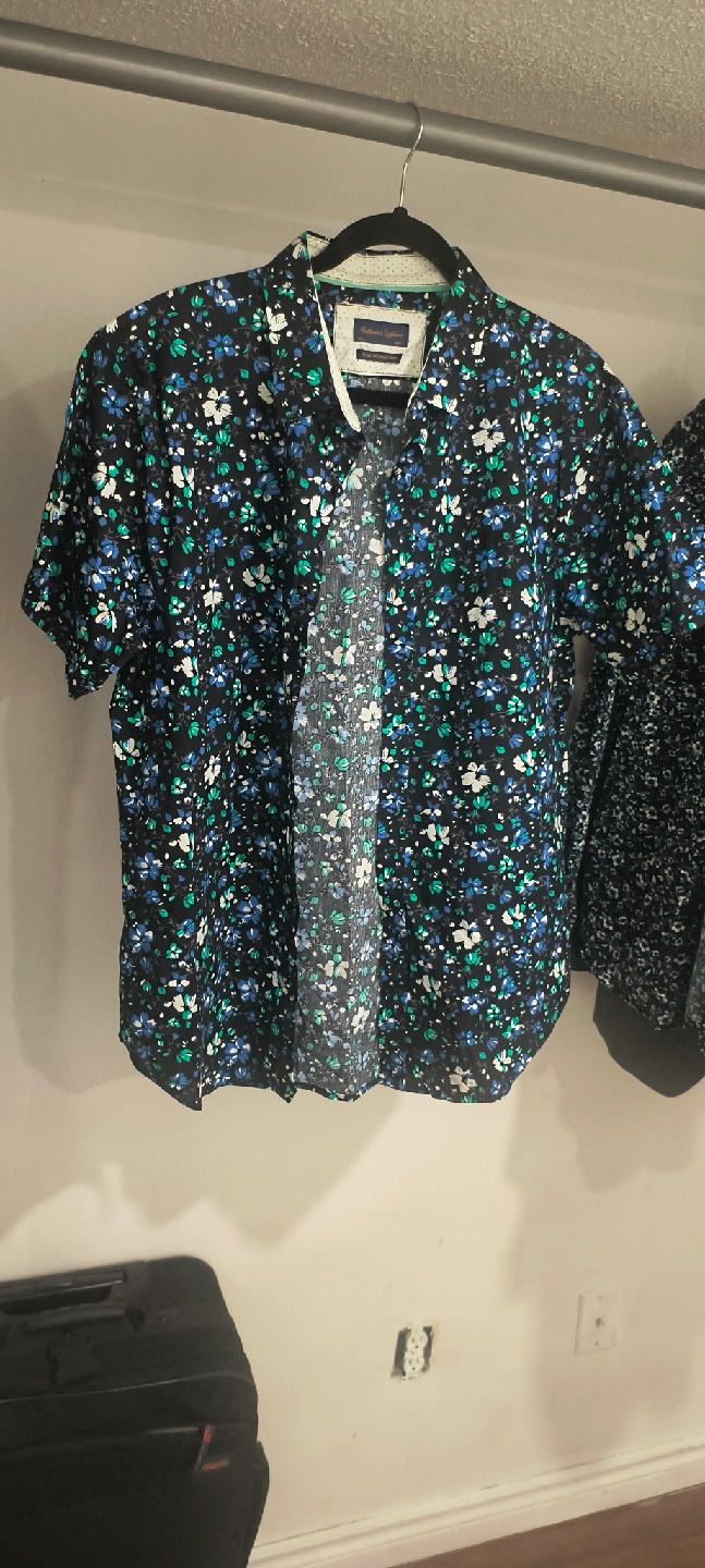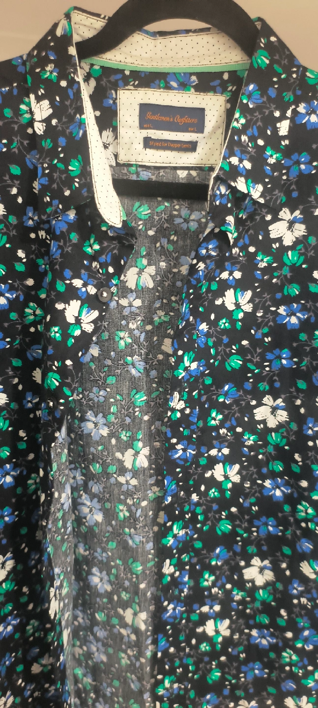 90Here's a Gentlemen's Outfitters button-up shirt with a cool floral pattern! It's black with blue, green, and white flowers. Perfect for a casual or dressed-up look
