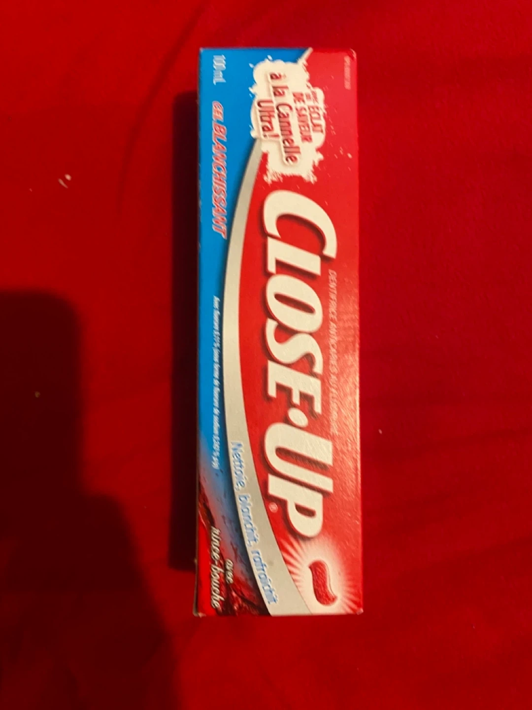 Tube of Close-Up toothpaste with cinnamon flavour. This is a whitening gel that cleans, whitens, and refreshes your mouth. It's a 100mL tube