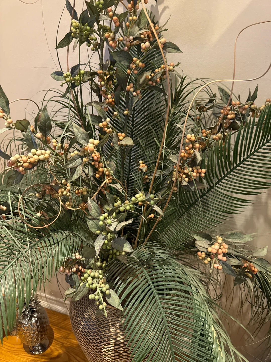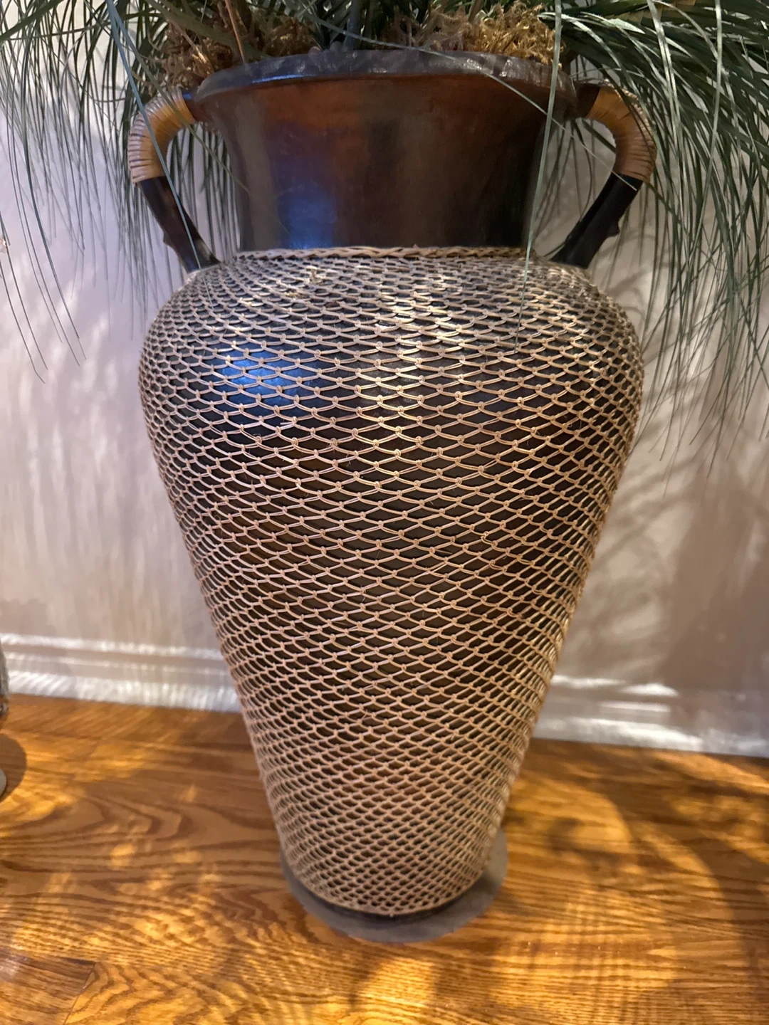 93Selling a decorative woven vase with a faux floral arrangement. It's in great condition and would look lovely in any home! The vase has a unique woven texture and comes with a beautiful arrangement of faux plants and flowers.