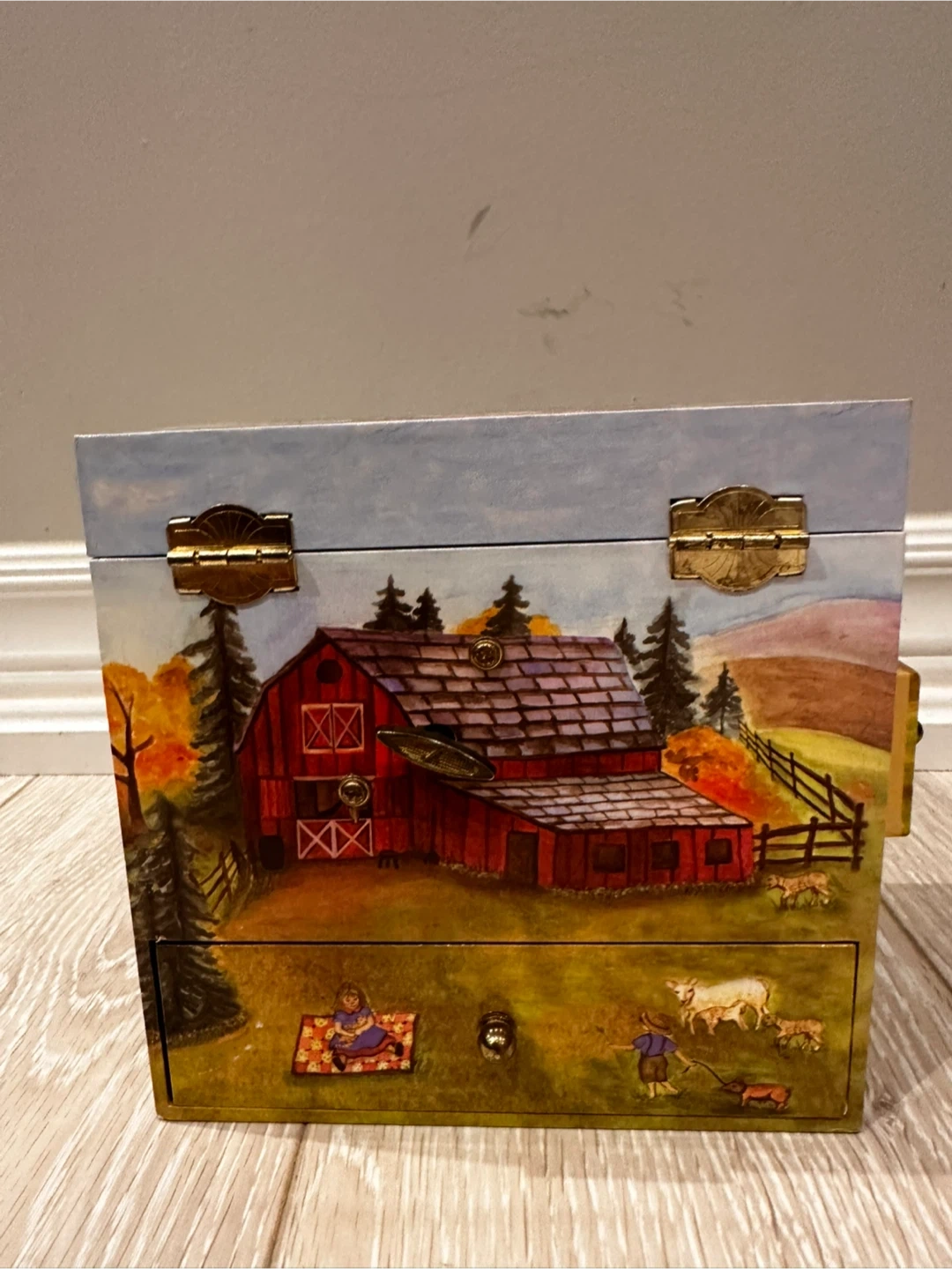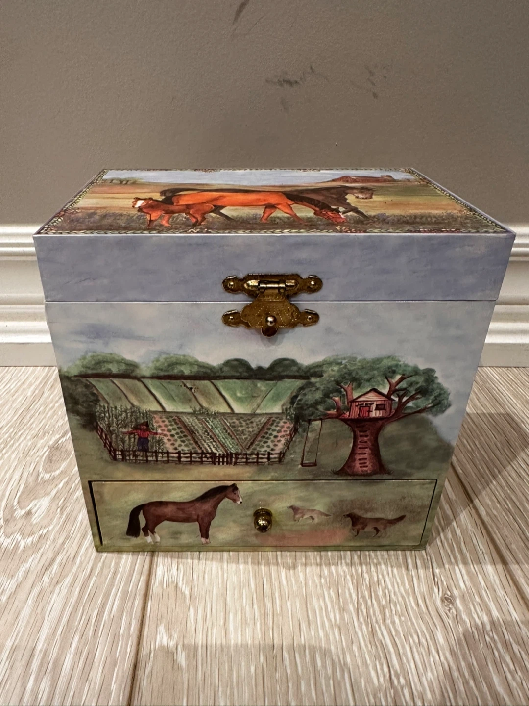 10Selling a charming vintage music box! It features lovely horse-themed artwork and a mirror inside. It has two drawers front and back, and two side compartments for storing your treasures. The music “My old Kentucky home” plays when you open the lid, and a horse figurine rotates. It's in great condition and would make a wonderful addition to any horse lovers’ collection