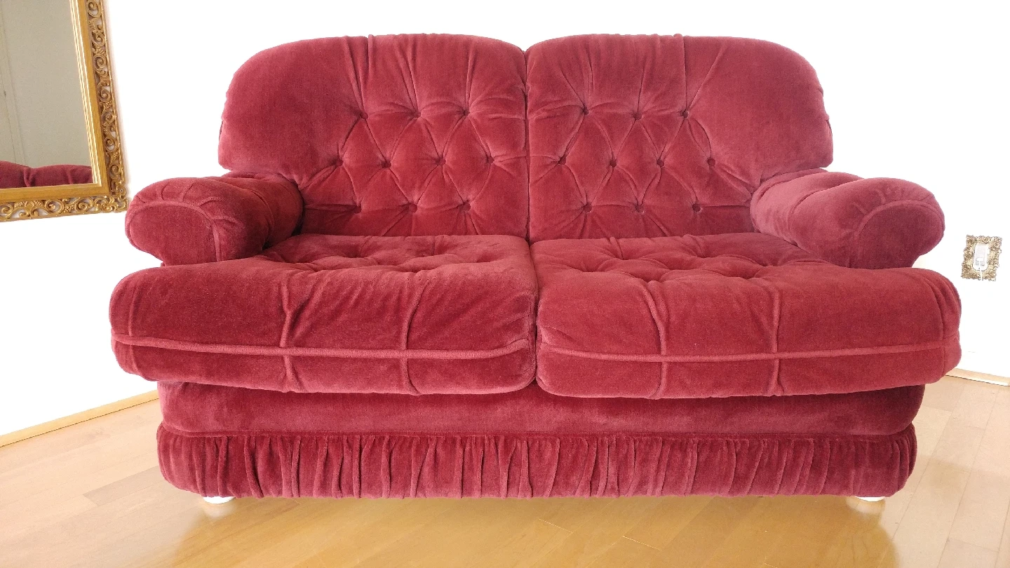 336Selling a comfy red velvet loveseat. It's in good condition and perfect for a small space or apartment. The velvet material gives it a nice, luxurious feel. It's a great piece to add some character to your living room or den.