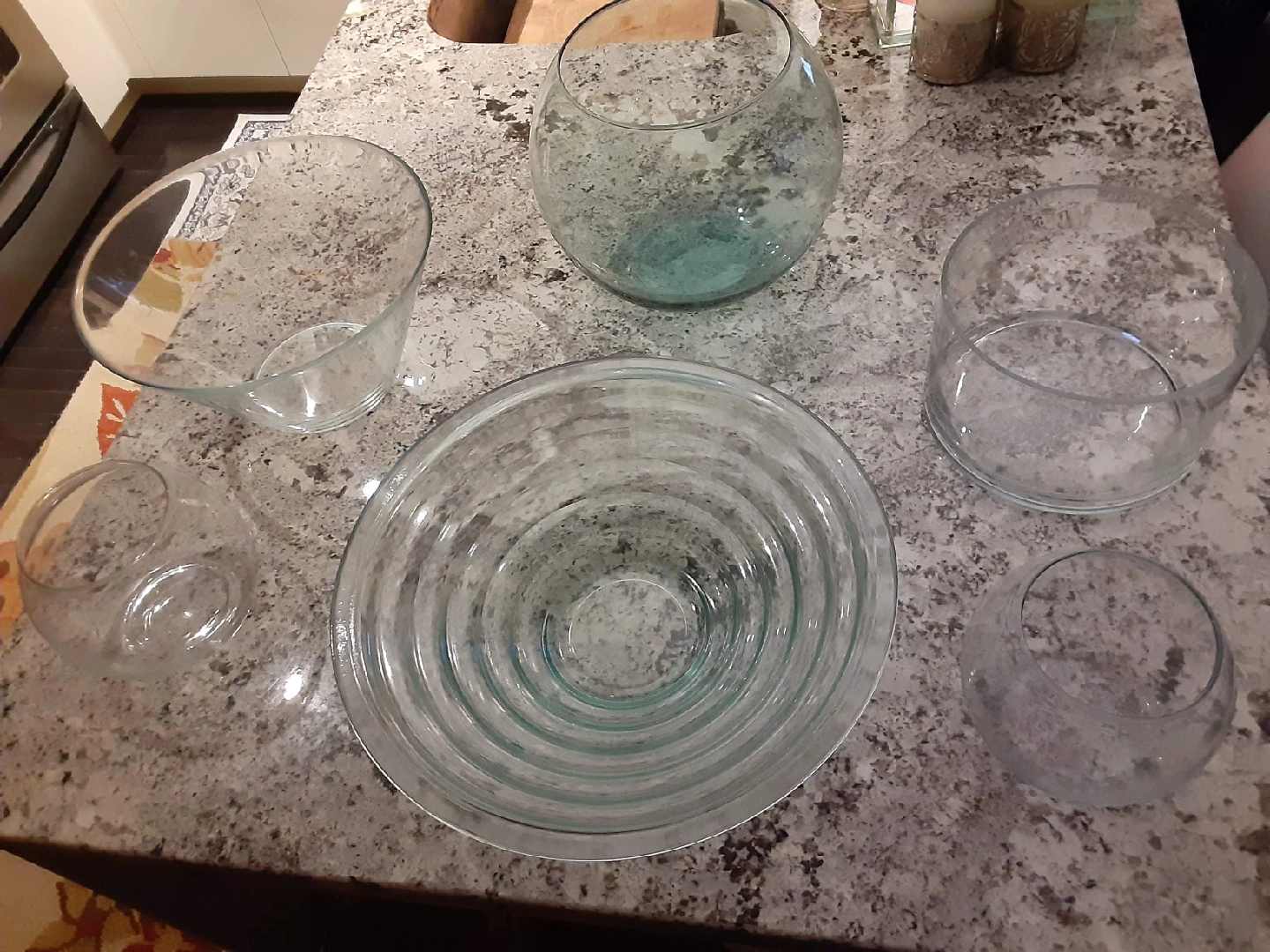 Selling a set of six assorted glass bowls. They come in various shapes and sizes, perfect for serving snacks, salads, or using as decorative pieces around the house. They are all in great condition and ready for a new home!
