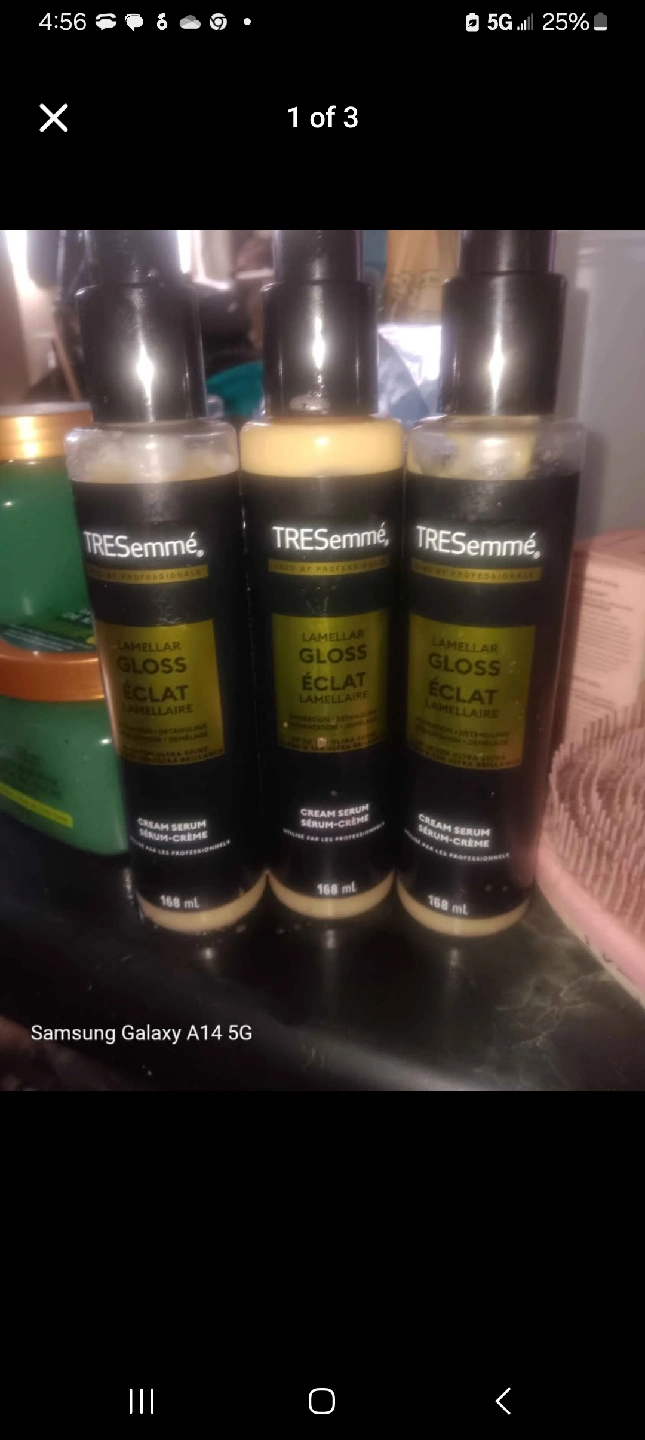 1000+Selling TRESemmé Lamellar Gloss Éclat Lamellaire Cream Serum. Each bottle contains 168 ml of serum. Great for adding shine and hydration to your hair! $ 5 for all 3 647-203-0411