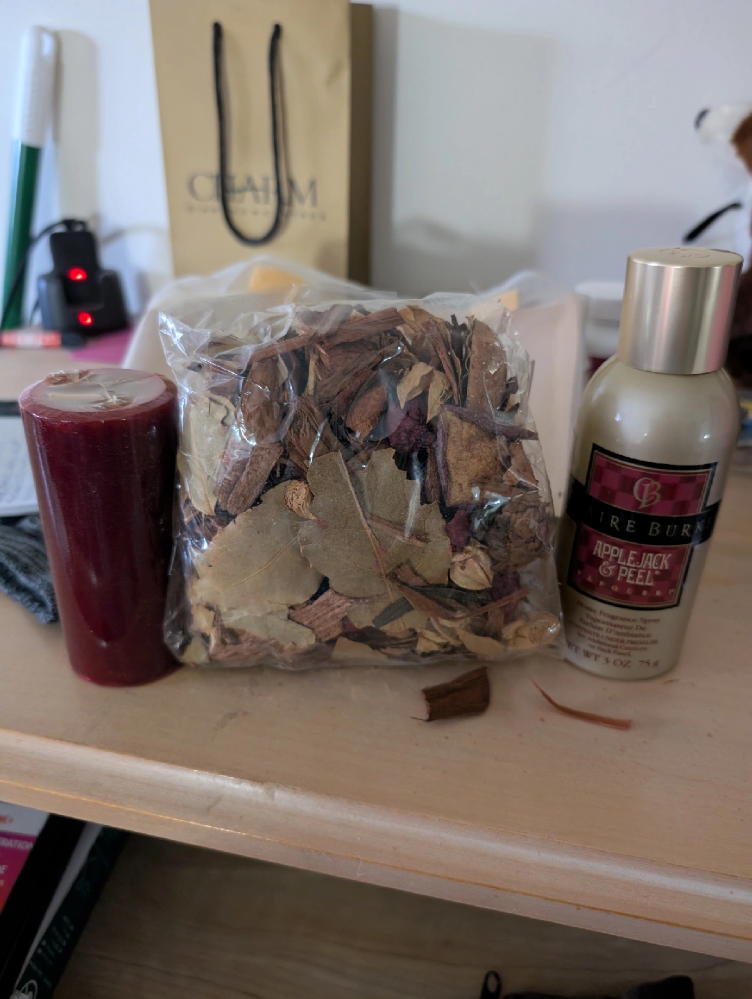Selling a Claire Burke Apple Jack & Peel potpourri set! It includes potpourri (85g), room spray (85g or 75g), and a scented candle (117g) The scent oil is missing Enjoy the cozy aroma of baked apples, cinnamon, spices, and a hint of citrus throughout your home