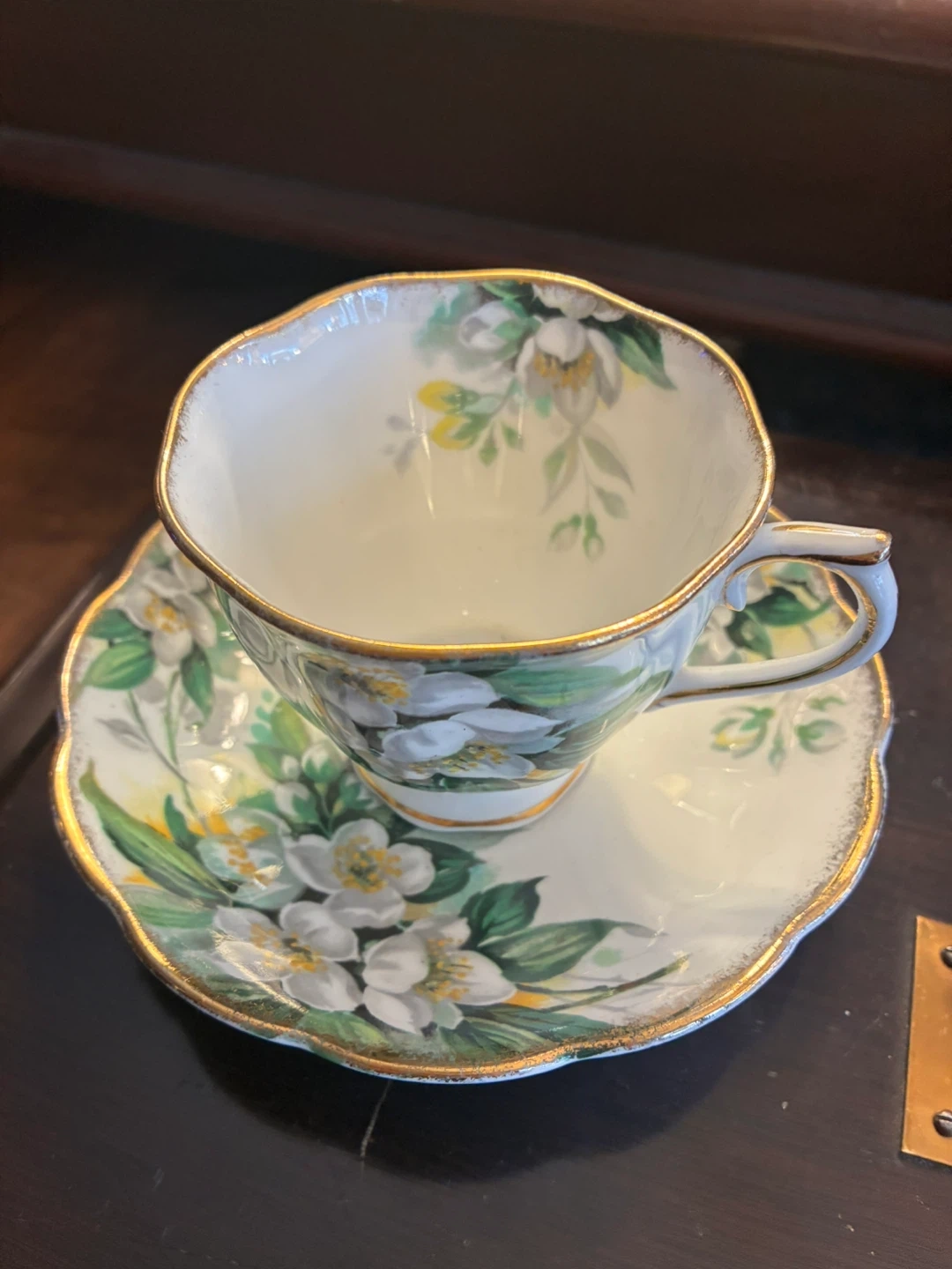 Beautiful Royal Albert bone china teacup and saucer set in the Orange Blossom pattern! The set is in great condition and features delicate white flowers with green leaves and a gold trim. Perfect for tea lovers or collectors. Cash only.