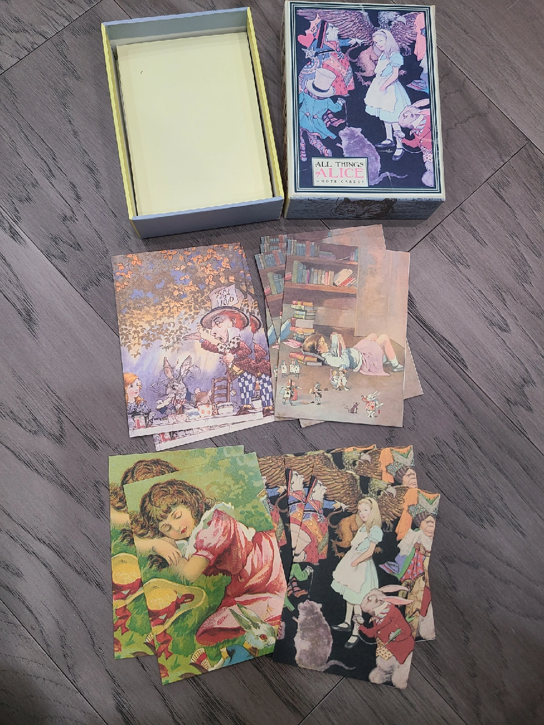 Selling a set of 'All Things Alice' note cards! These cards feature lovely illustrations from Alice in Wonderland. They come with a box for storage. Perfect for sending a whimsical note to a friend or adding a touch of Wonderland to your stationery collection. 11 blank cards and matching envelopes.